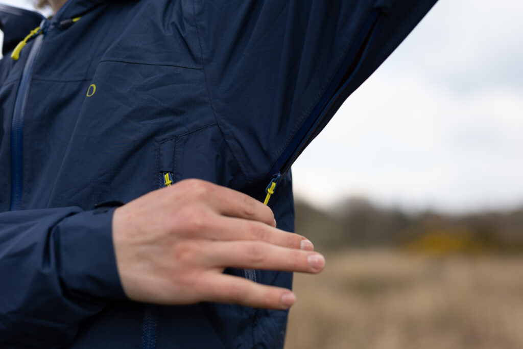 I will say that the level of breathability positively surprised me during our uphill slog through the rain. I didn’t expect such an affordable and lightweight set of waterproofs to breathe as well as they did. When used in conjunction with the Rab Nexus Hoody and Mountain Equipment Ibex Mountain Trousers, I found that both the jacket and trousers didn’t produce the ‘clammy’ feeling which is normally common in hard shell waterproofs. This may be due in part to the 2.5 layer construction of the jacket and trousers – which I found in real-world terms to outperform my, admittedly much older, 2 layer GoreTex PacLite jacket, even if it doesn’t on paper (in terms of MVTR). A further aid to the breathability was the large pit zips, which defend from the elements with YKK Aquaguard zips.