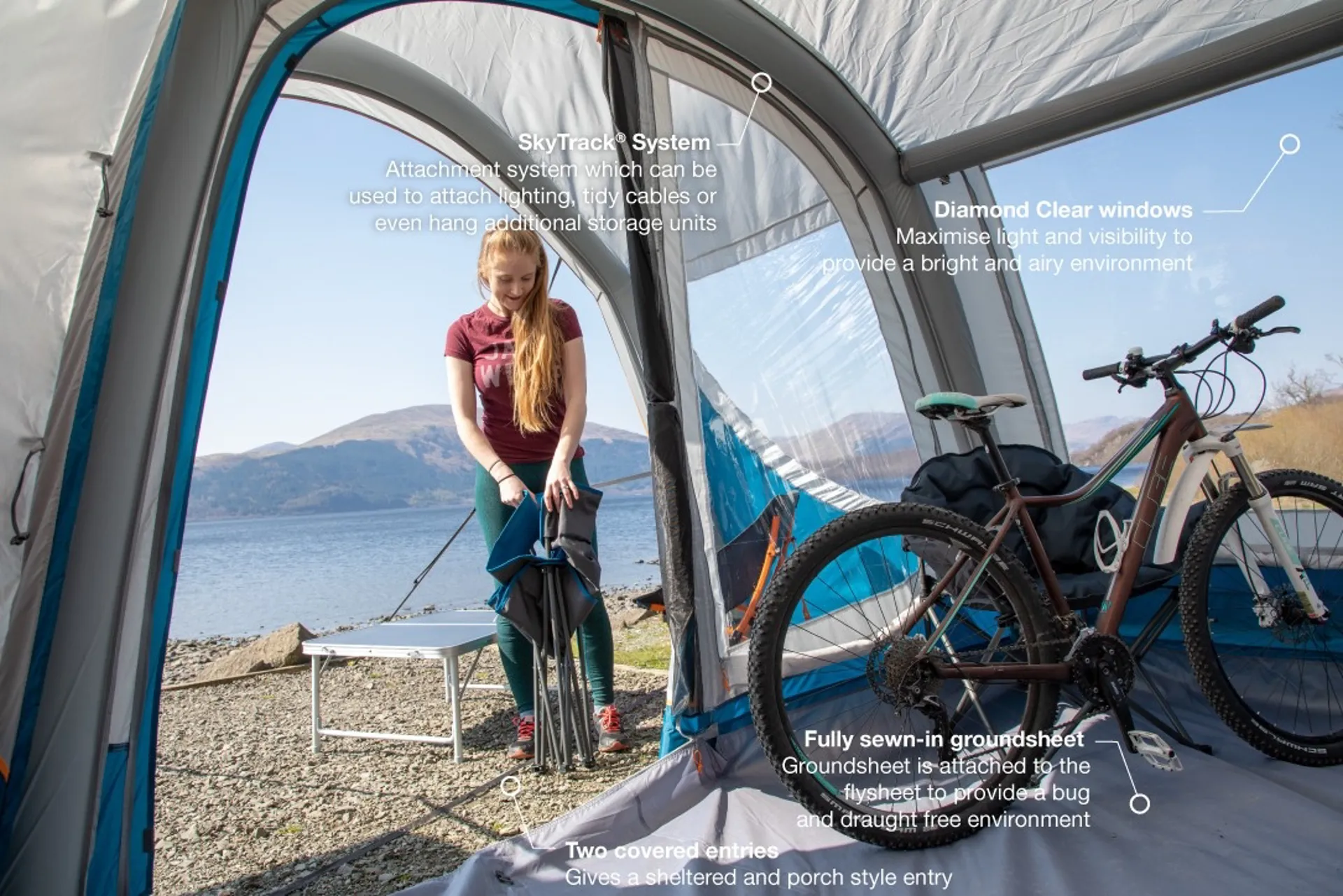 Unlike a traditional awning, the Magra features a side attachment to ensure you are always facing the view. This design also means this awning features mesh backed, front and rear entrances to enable you to create the perfect set up.