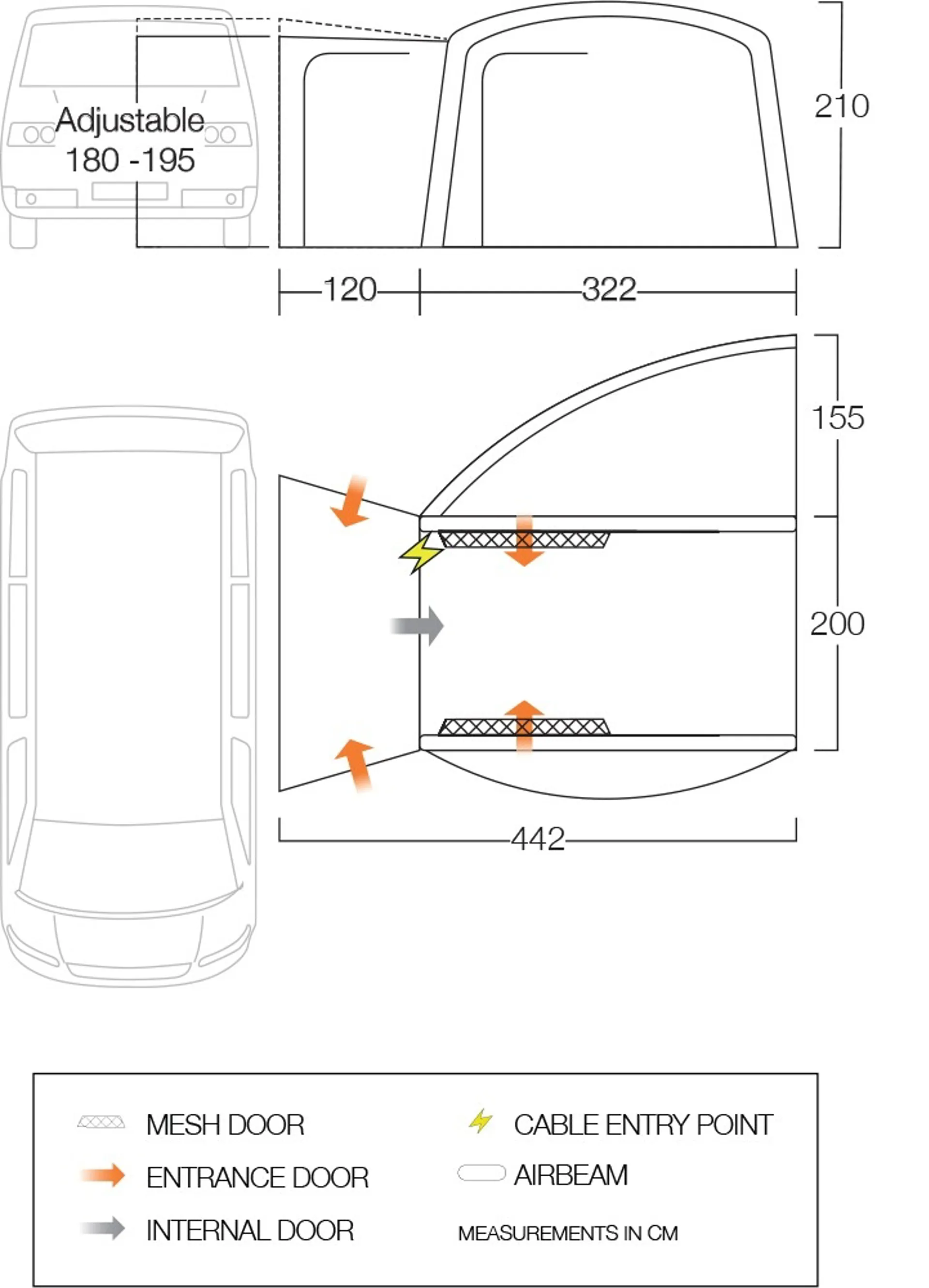 Designed to fit campers and conversions with attachment height of 180cm-195cm, this awning can be attached to your vehicle via various attachments. This awning comes with 250cm, 6mm Kador strip, a pole sleeve, two hook & loop tabs and two webbing straps.