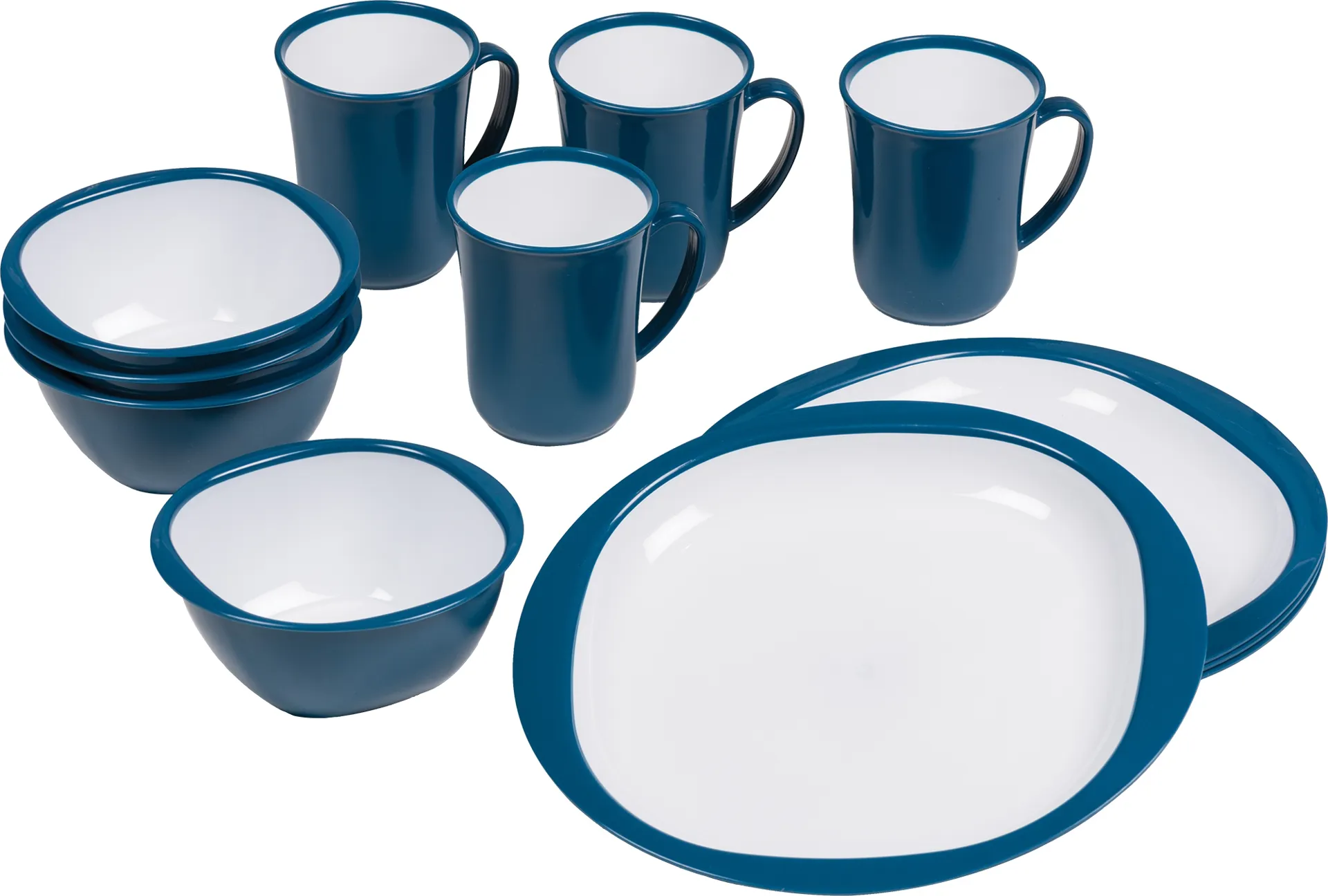 The blue 12 piece Dinner Set from Kampa consists of 4 dinner plates, 4 cereal bowls and 4 mugs.