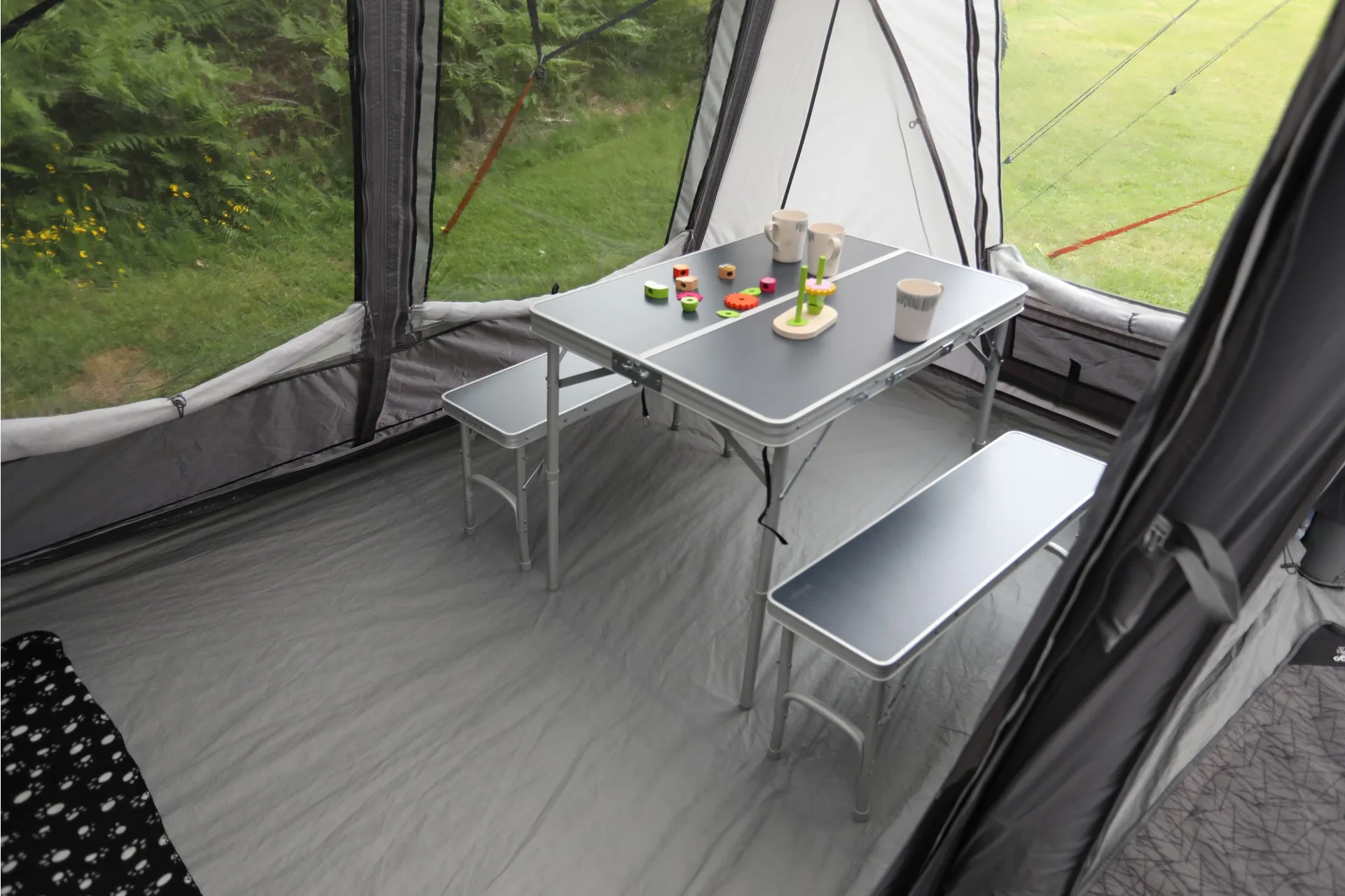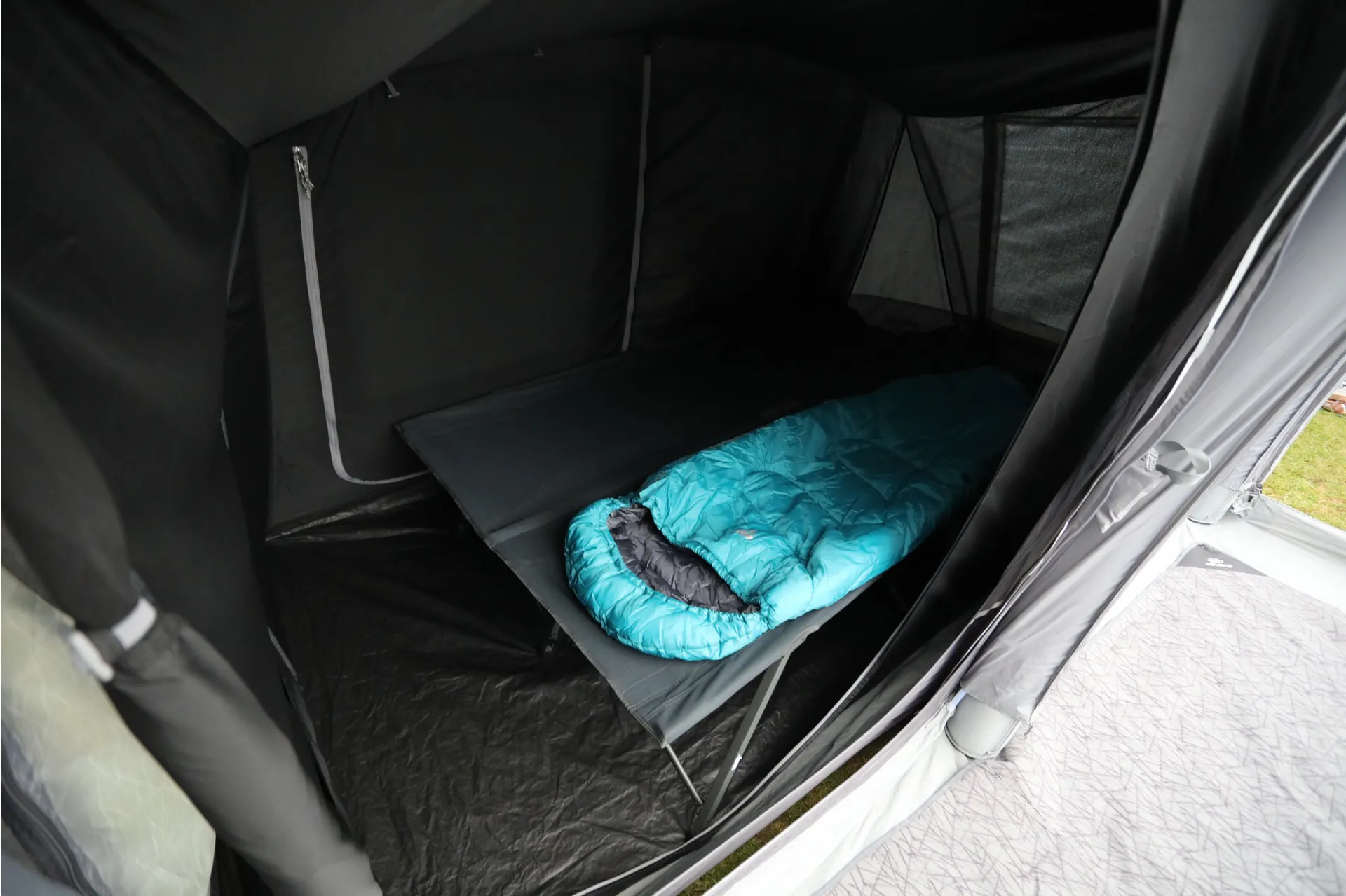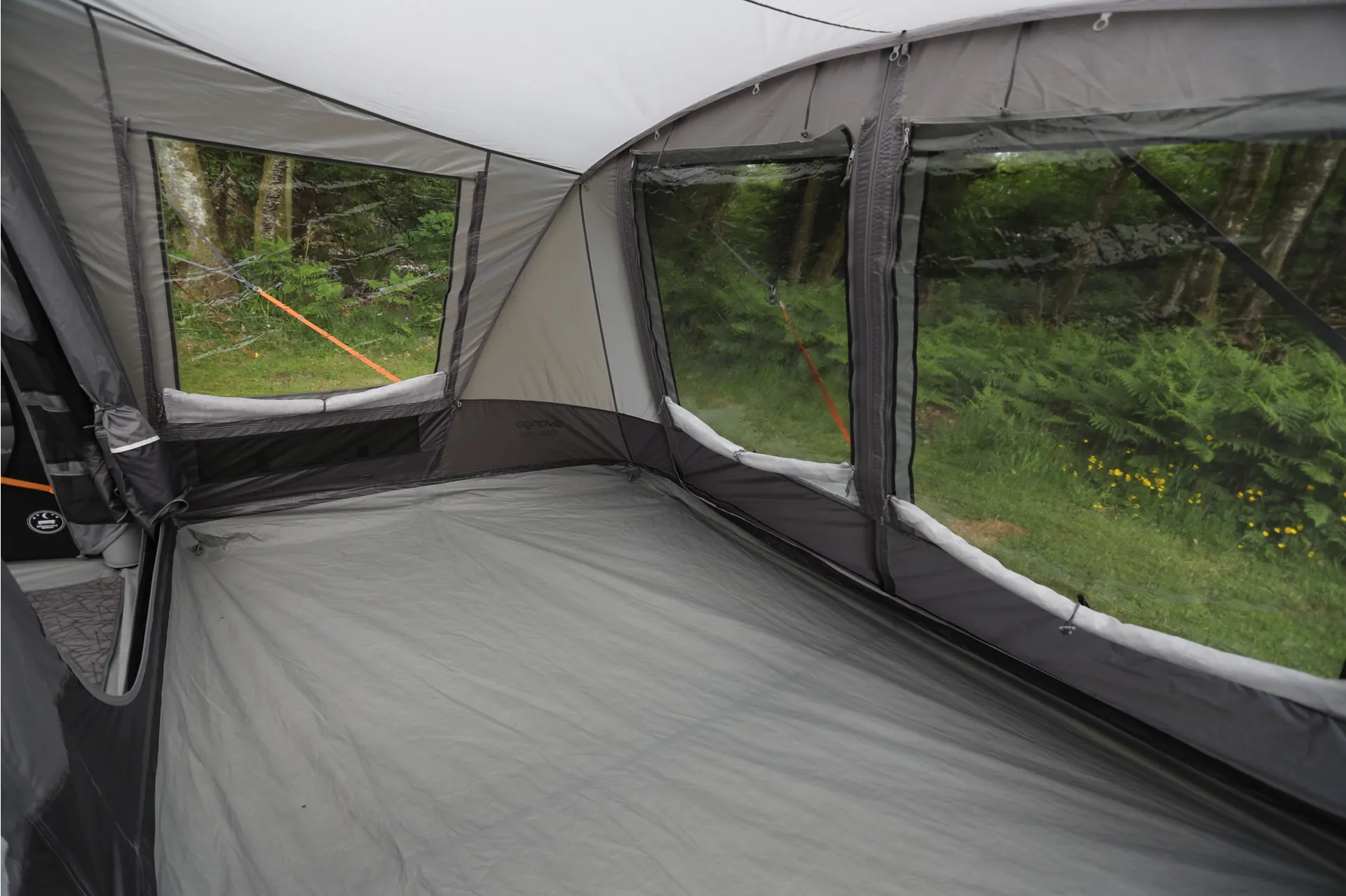 The Vango Studio attaches to the side panels of the Anantara to expand the tent's living space.