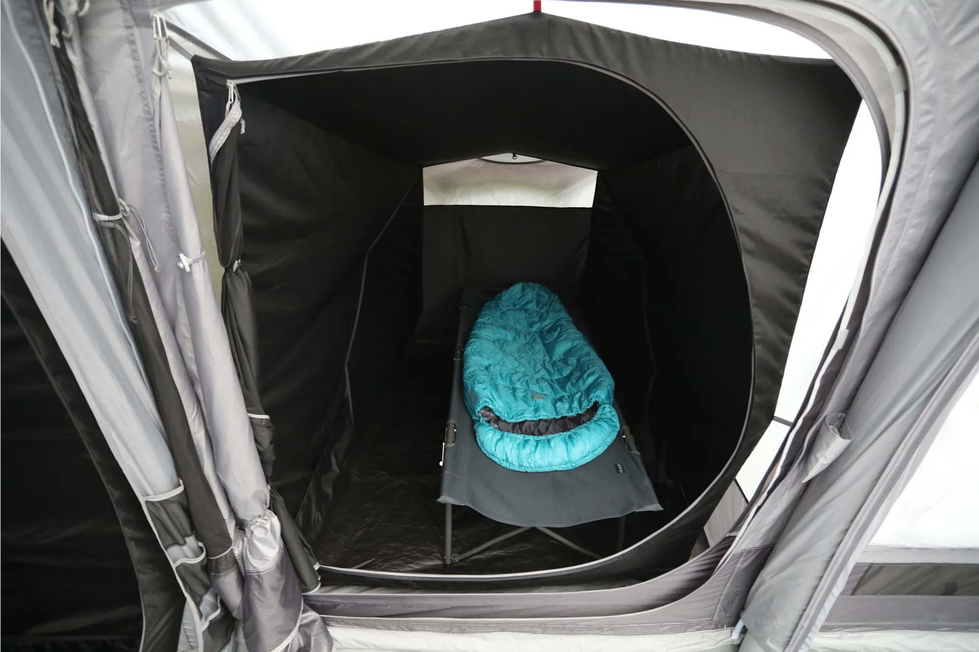 The Vango Studio attaches to the side panels of the Anantara to expand the tent's living space.