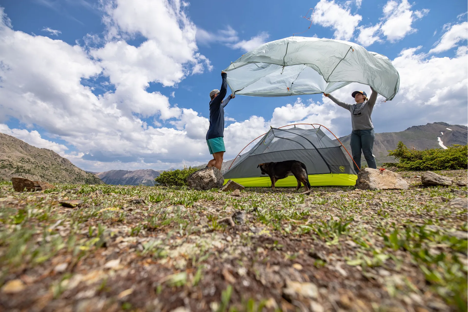 Flysheet: Proprietary HyperBead™ fabric; 15D nylon with 20D solution dyed ripstop and 1500mm waterproof coating without intentionally added PFAS