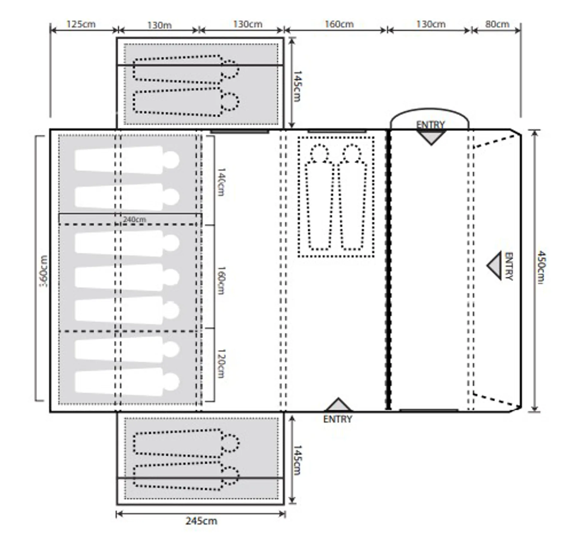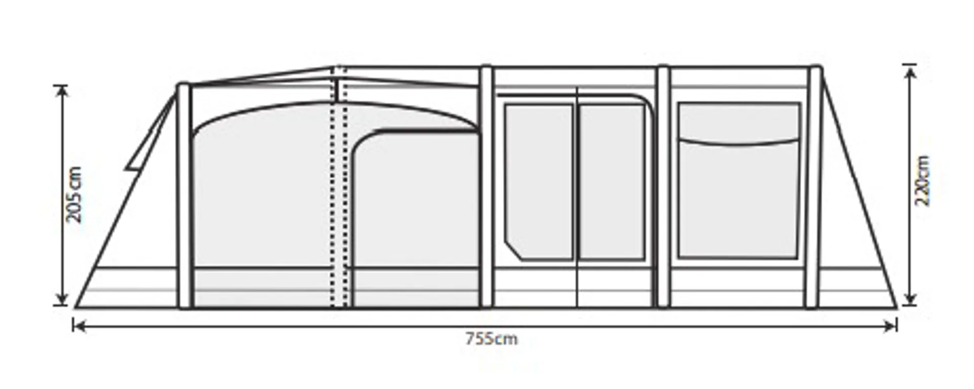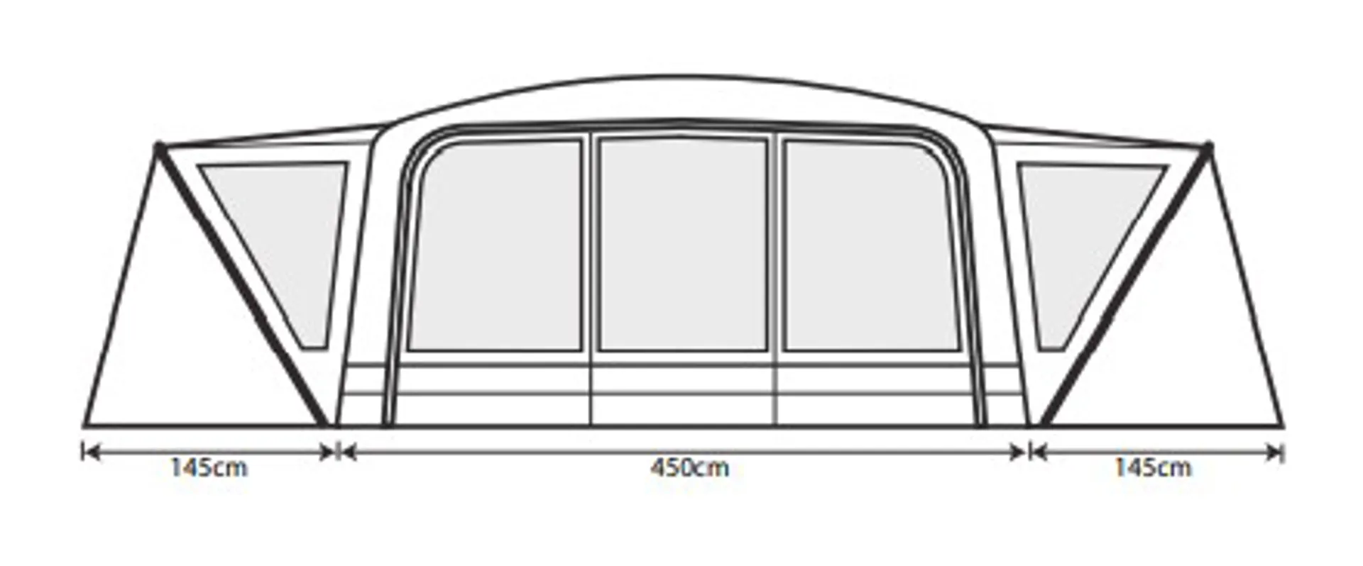 • Footprint of tent: 755 x 450cm +145cm x2