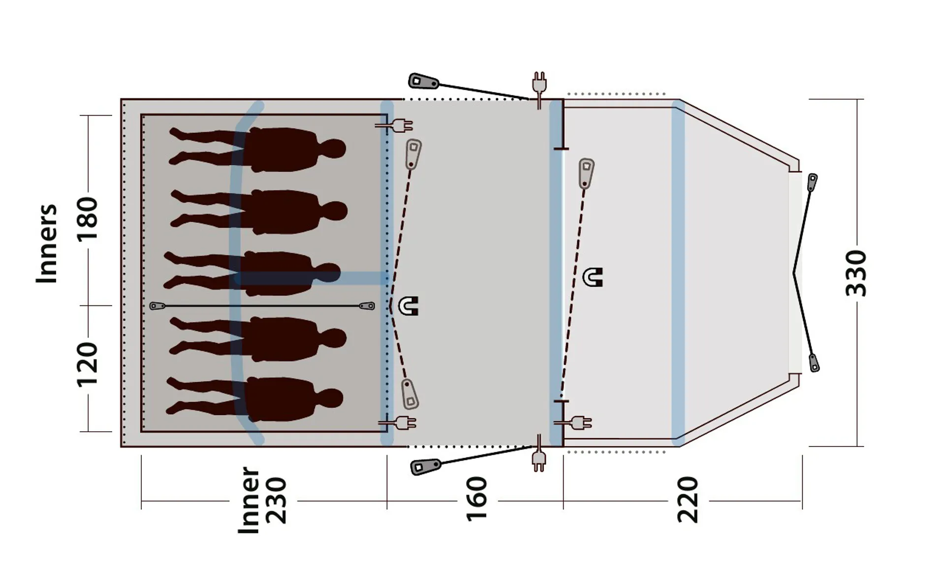 HookTrack System throughout the main living area enables campers to safely, and easily hang lighting and other items in their tents. It consists of durable, sturdy transparent piping on selected air tubes and 10 reliable clip hooks. Offering flexible positioning options, this system enables wires for lighting and other electrical devices to be routed securely out of the way and allows lights to be positioned where needed. Combined with the