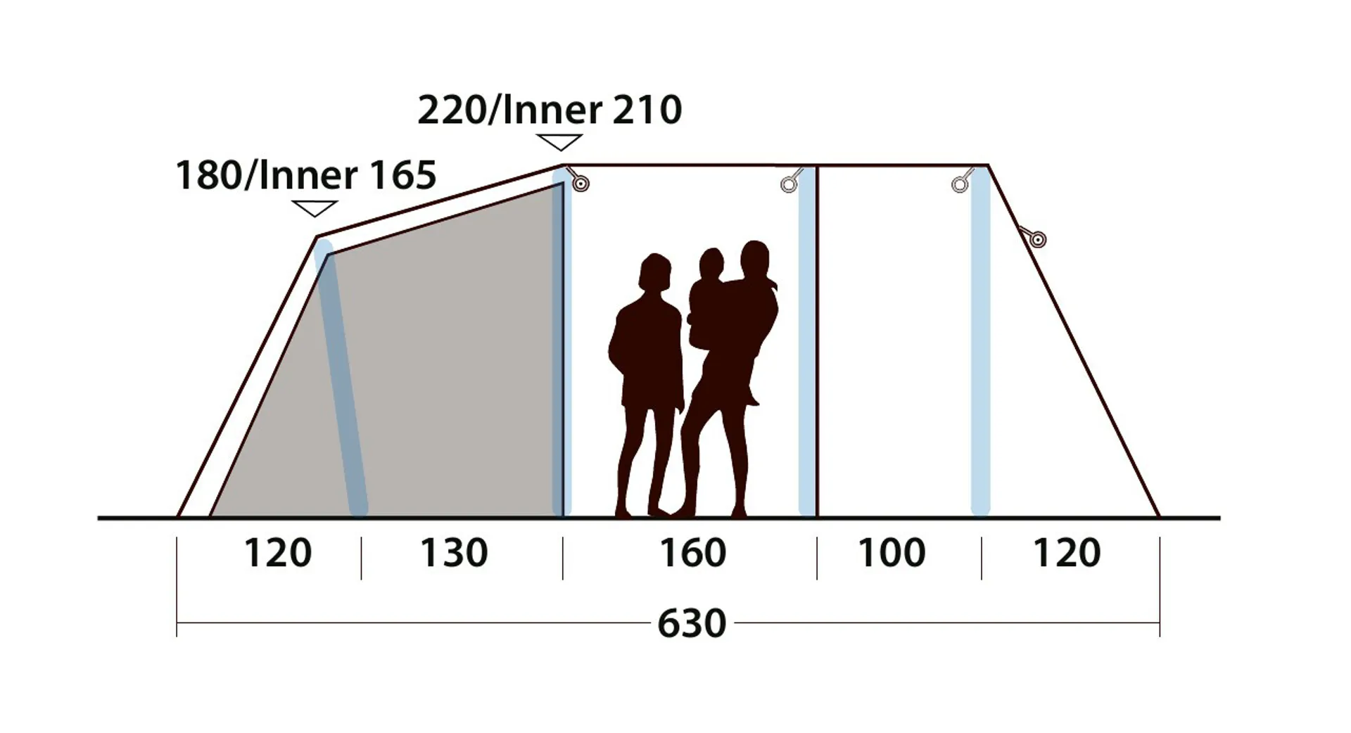 PrivacyThe three zones provide a wet room at the front for storage, or dining in the shade while enjoying the outside. This front section also features a detachable bathtub-style groundsheet, making it perfect to store wet gear or when you want to extend your living area. A separate dry living room with two additional side entry doors and a bedroom make this tent perfect for active campers. Many large tinted windows on the sides and front not only provide panoramic views but brings the outside in and zip up curtains on the inside of the tent offer full flexibility of choice between total privacy, letting in some daylight or enjoying the views.