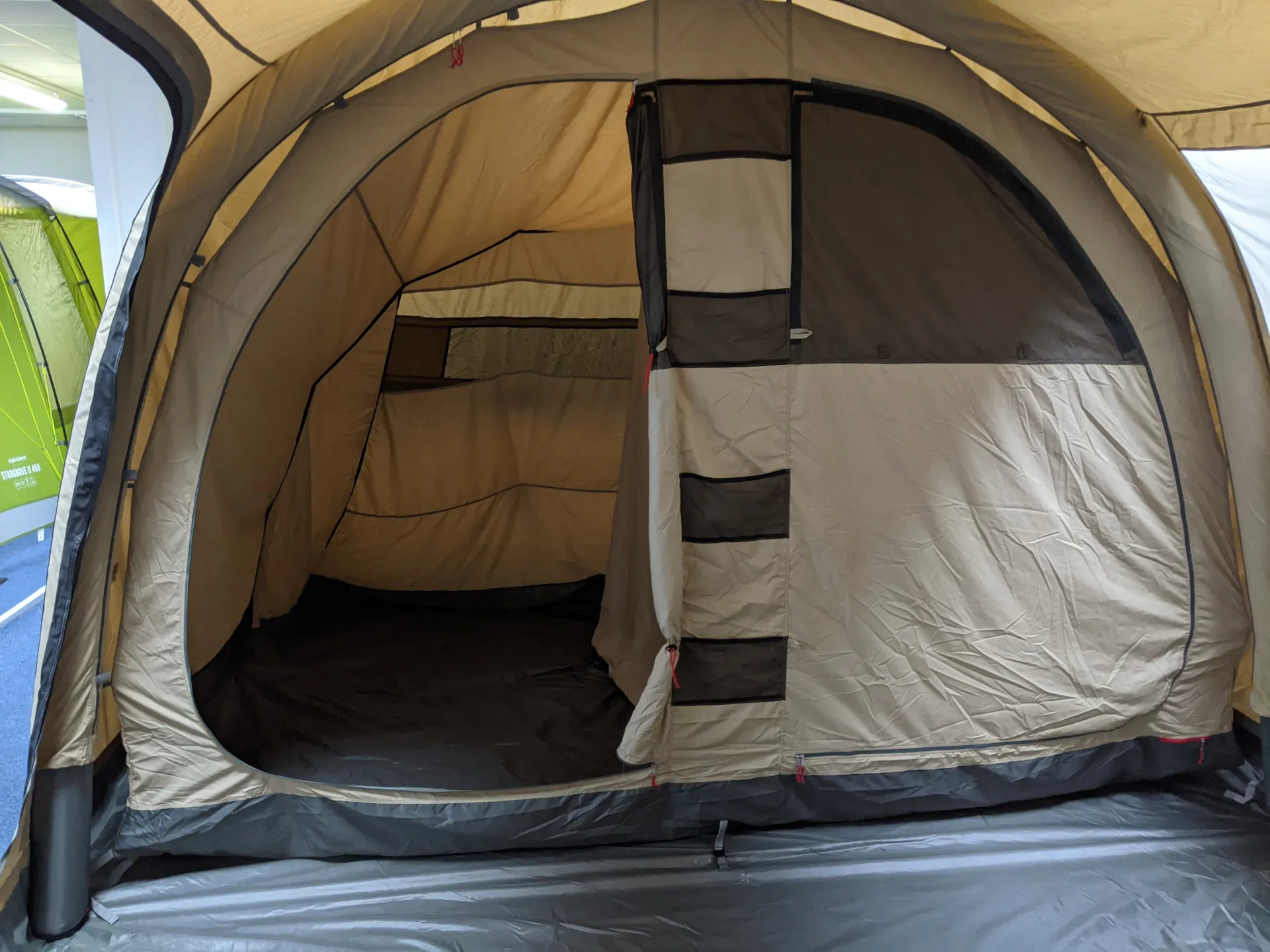 The front door is backed with a mesh panel to keep the tent insect free, and a large, poled front canopy provides additional sheltered outside living space. New low vents beneath the side windows work in conjunction with the rear vent to aid air flow and the inner tent divider can be removed to make a single, or double bedroom.
