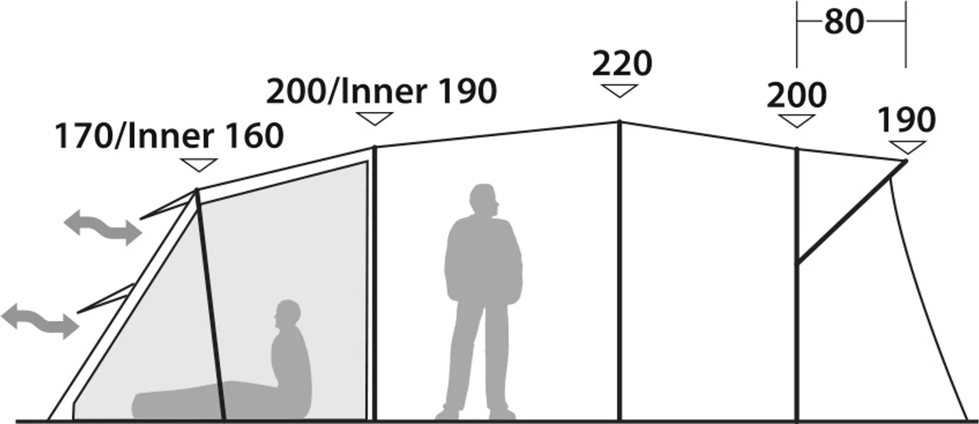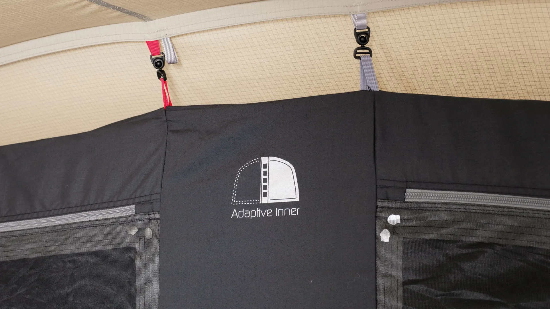 The main double bedroom inner features a black-out roof panel and sides to reduce light penetration, improving sleep quality by allowing you to sleep longer, have that lie-in or prevent young campers waking up at sunrise. Roof curtains inside the inner tent can be opened to reveal a mesh panel to help let in light, while keeping the bugs out and mesh pockets to store small items. This adaptive inner even folds and toggles back to the centre to increase living space when required.