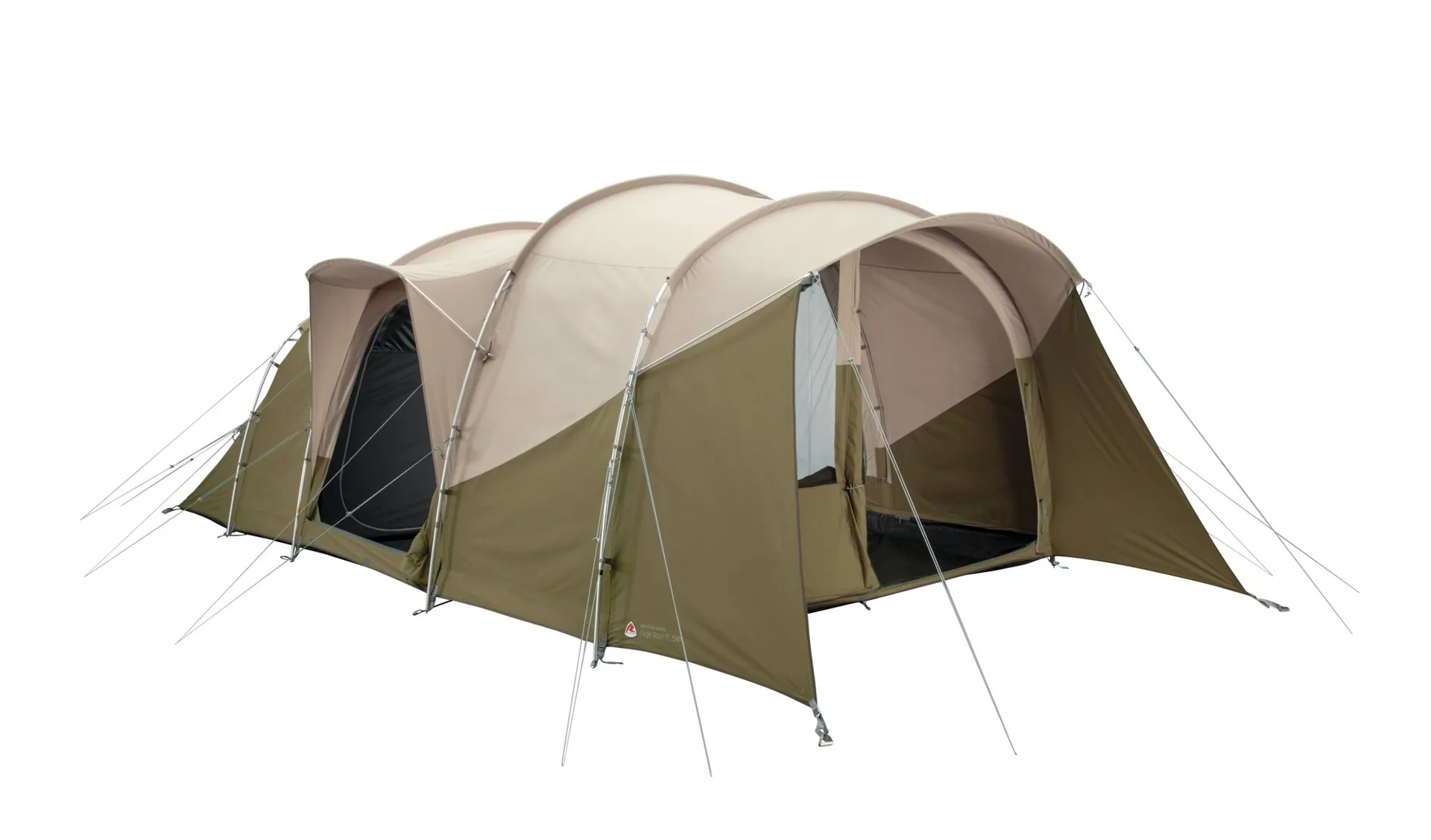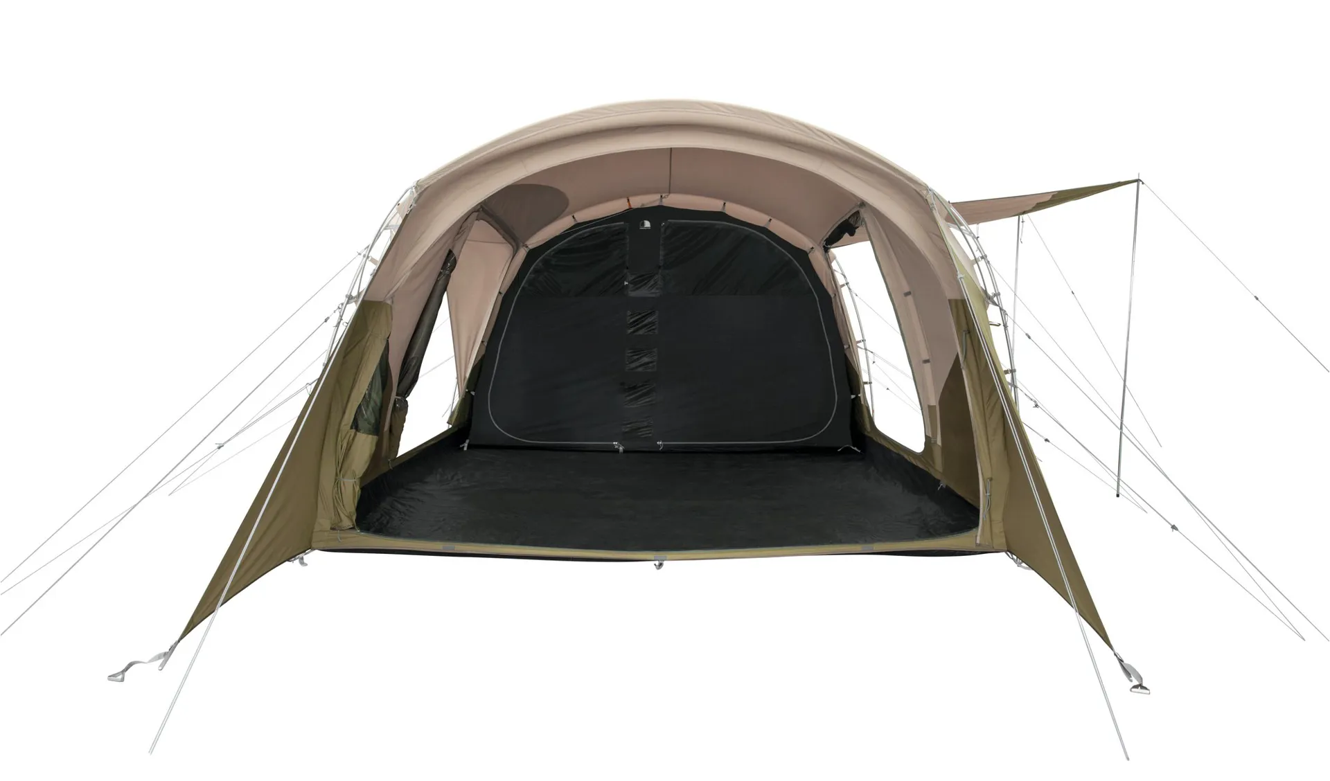 The living features two side doors (one with a rain safe canopy) that double up as windows and are backed by a waterproof curtain with upper PVC panels, offering full flexibility between letting in light, and fresh air while keeping the bugs out. The large front door enables you to enjoy close-to-nature experiences by providing a veranda feel and unhampered access to the outside. While enhancing the tent's light, airy ambience, a second double zipped mesh door provides insect-free ventilation without compromising on view, comfort, and safety. A deep canopy over the front door offers shelter from downpours, and the front skirts can be toggles back to create a full panorama view.