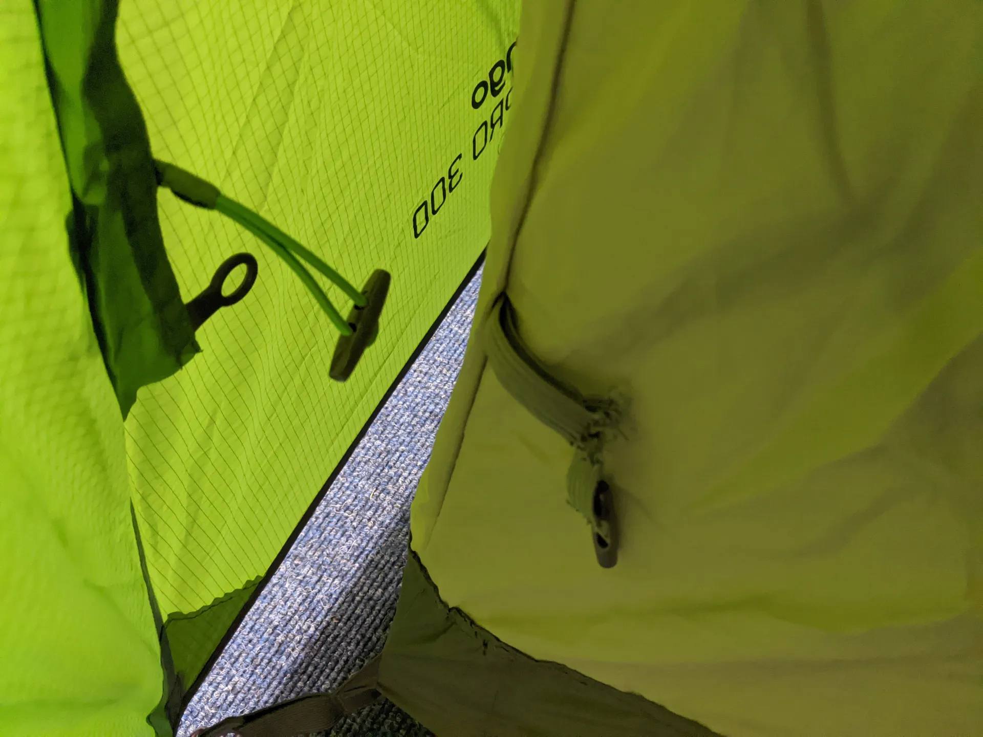 This demo has been pitched and shows signs of use. There is a repair to a guyline attachment point (pictured) and there is a broken inner elastic attachment (pictured) which does not affect the use of the tent.