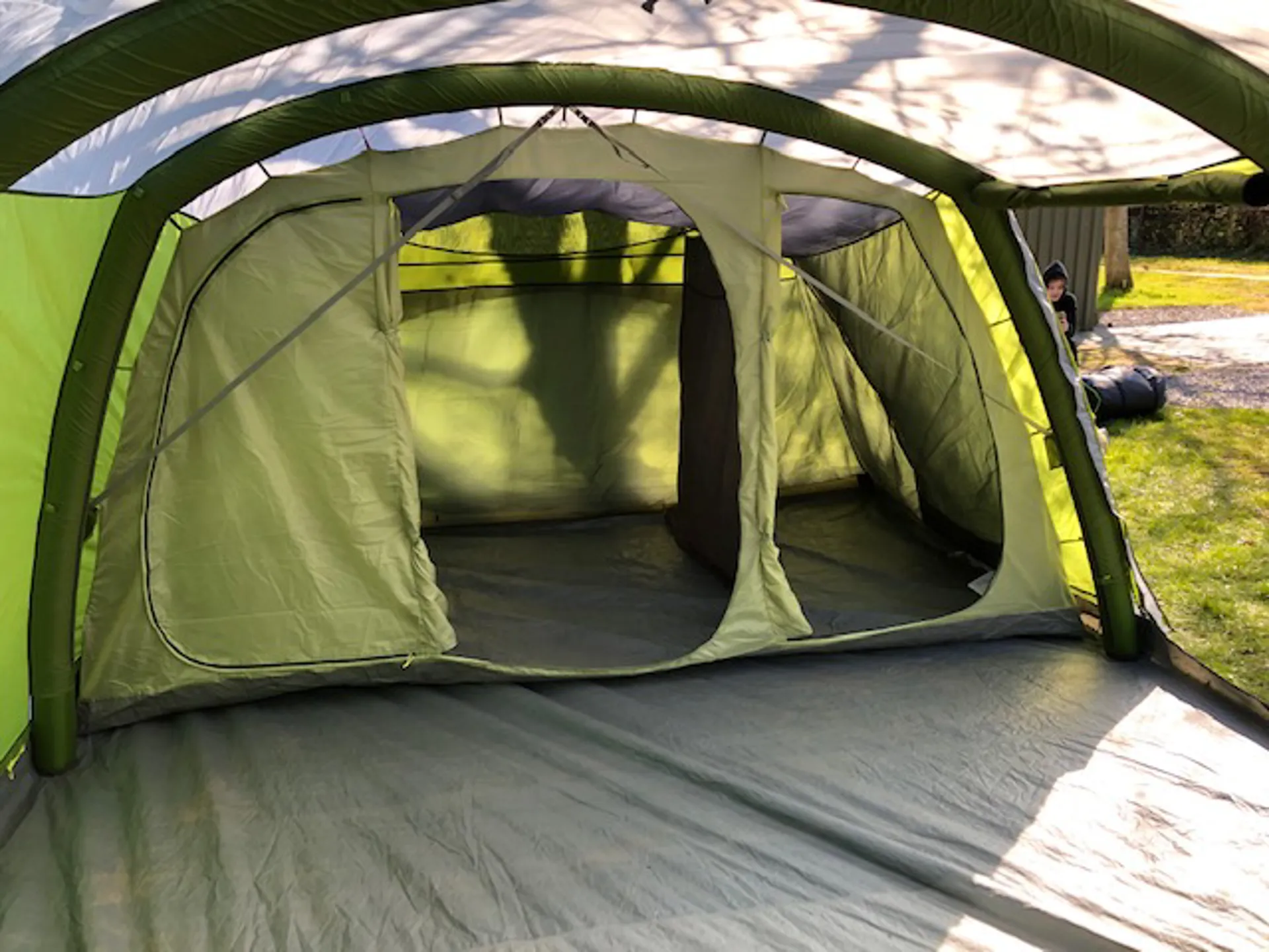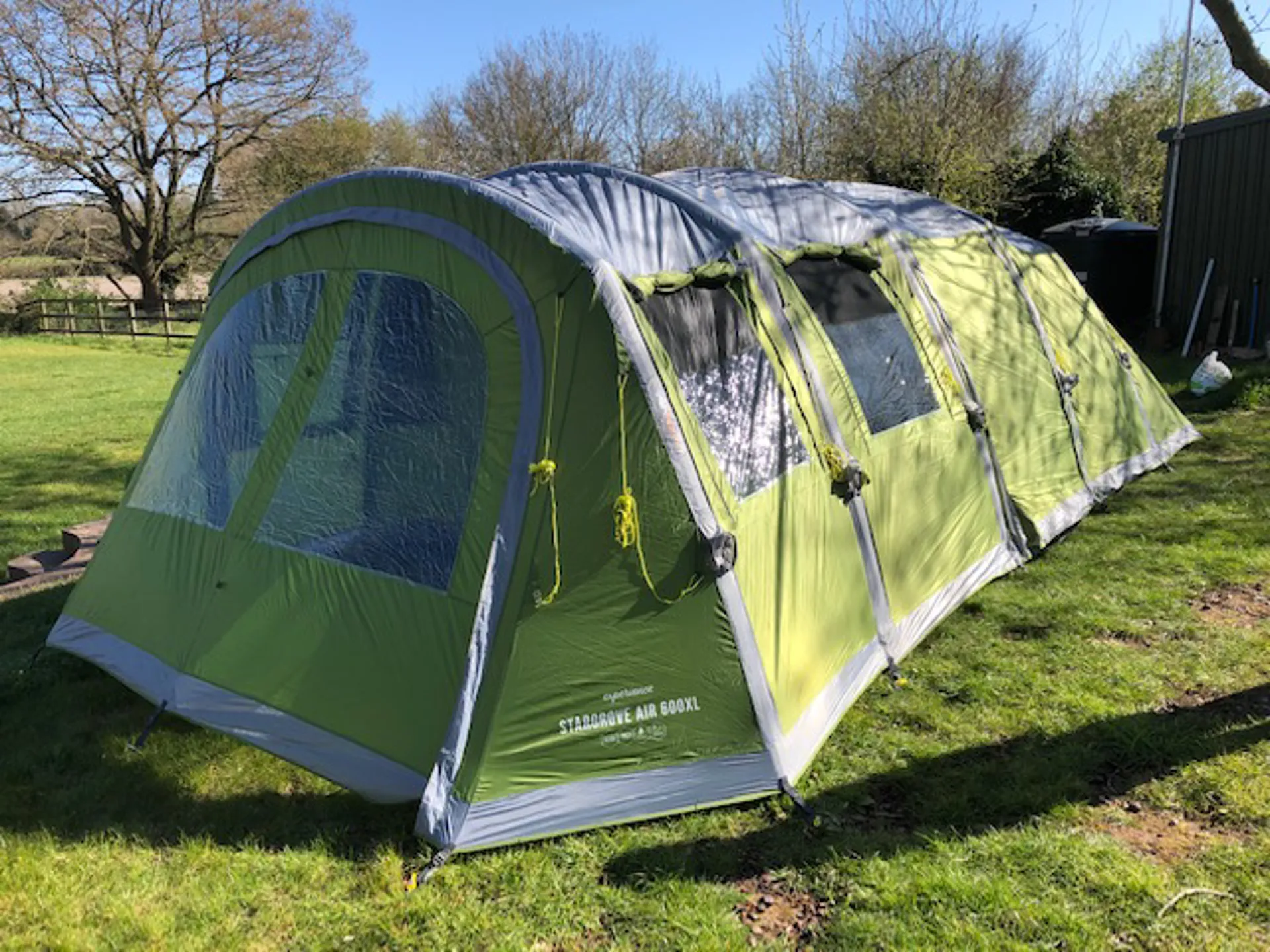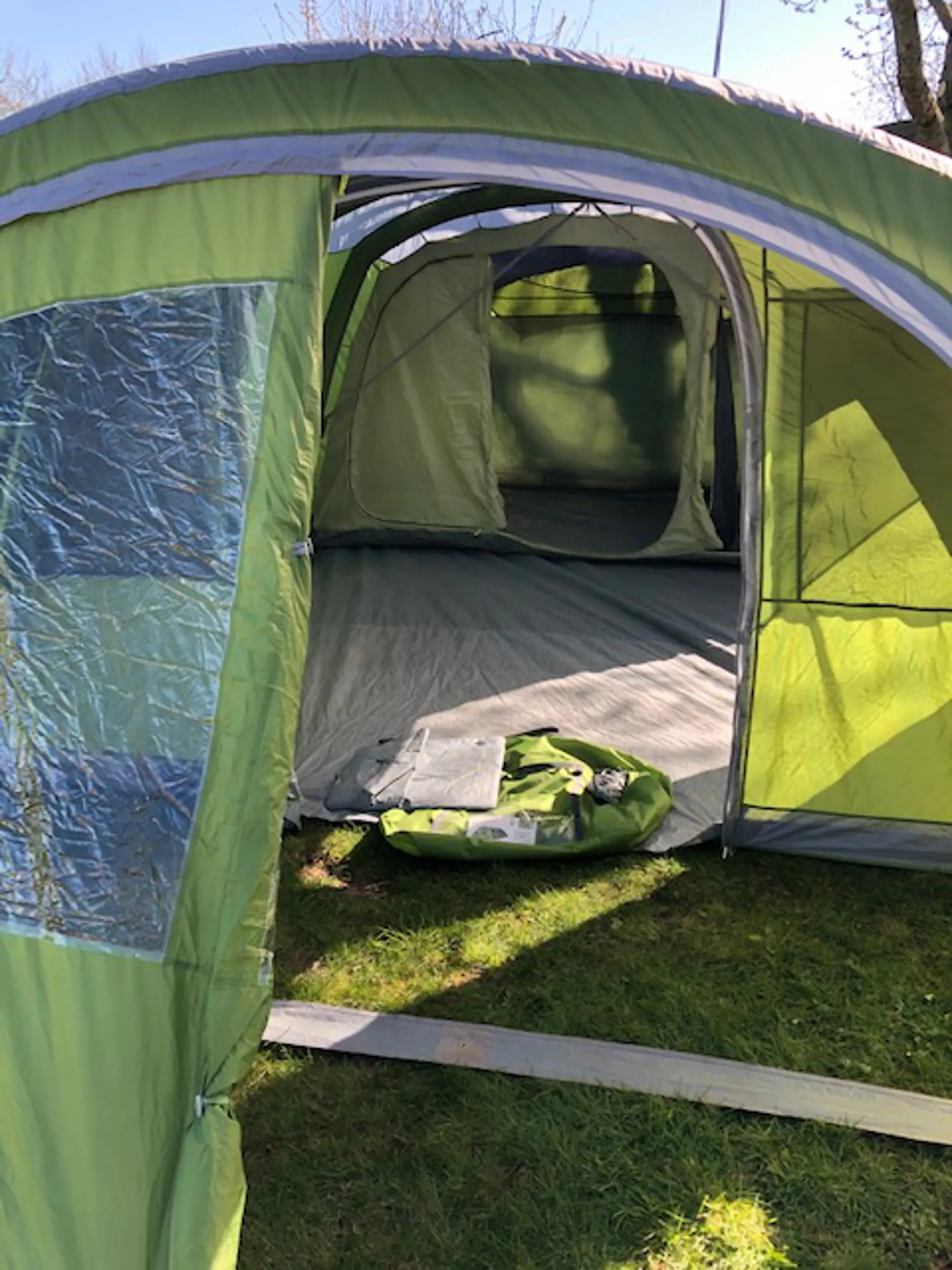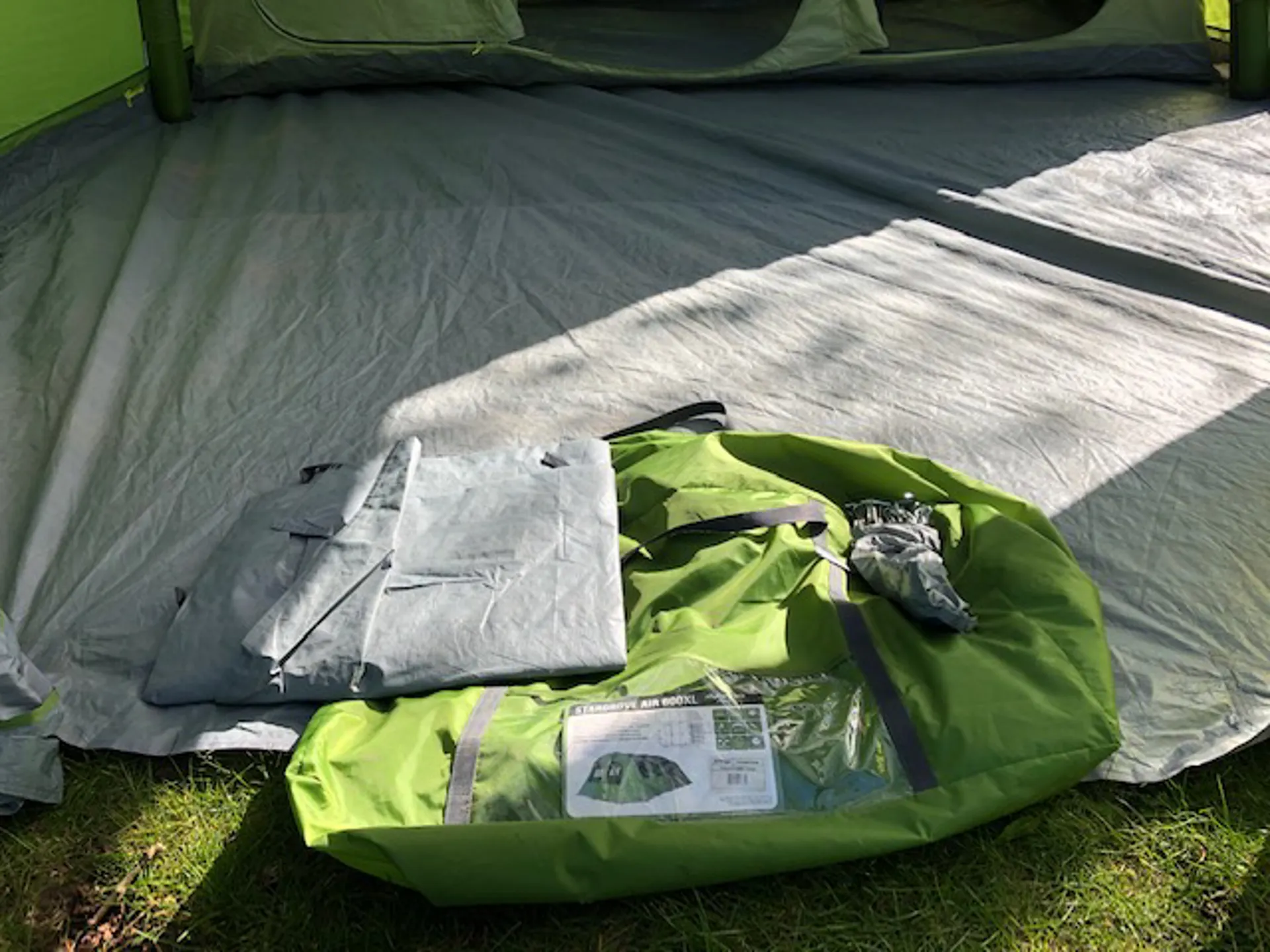 Good condition throughout includes pegs and pump and all storage bags. Groundsheet is pretty clean inside and out and this tent also includes the removable groundsheet for the porch area. Flysheet is in excellent condition with little or no sign that it has been used outside. Please note that the bedroom inner tent is missing a divider as shown.