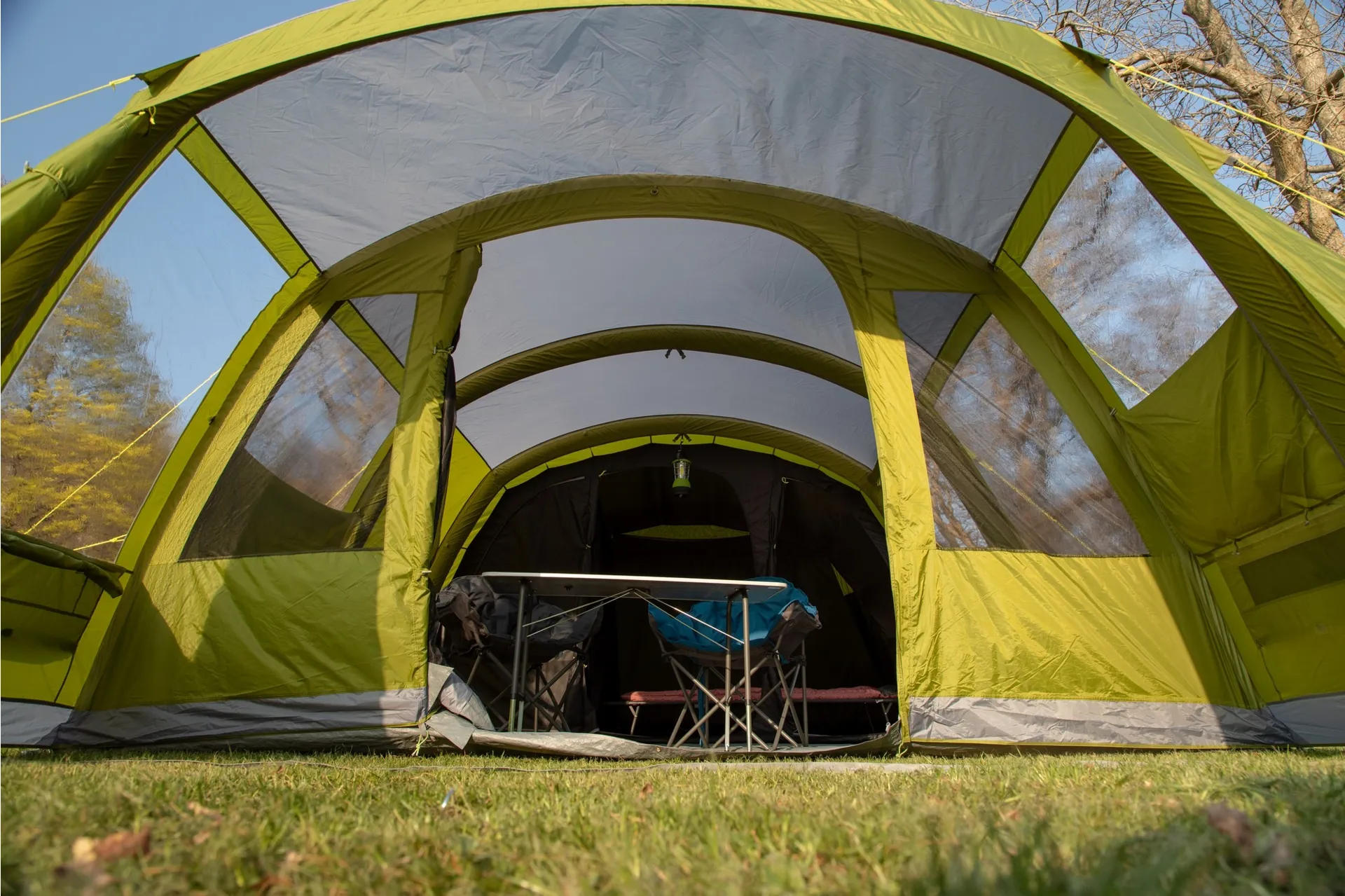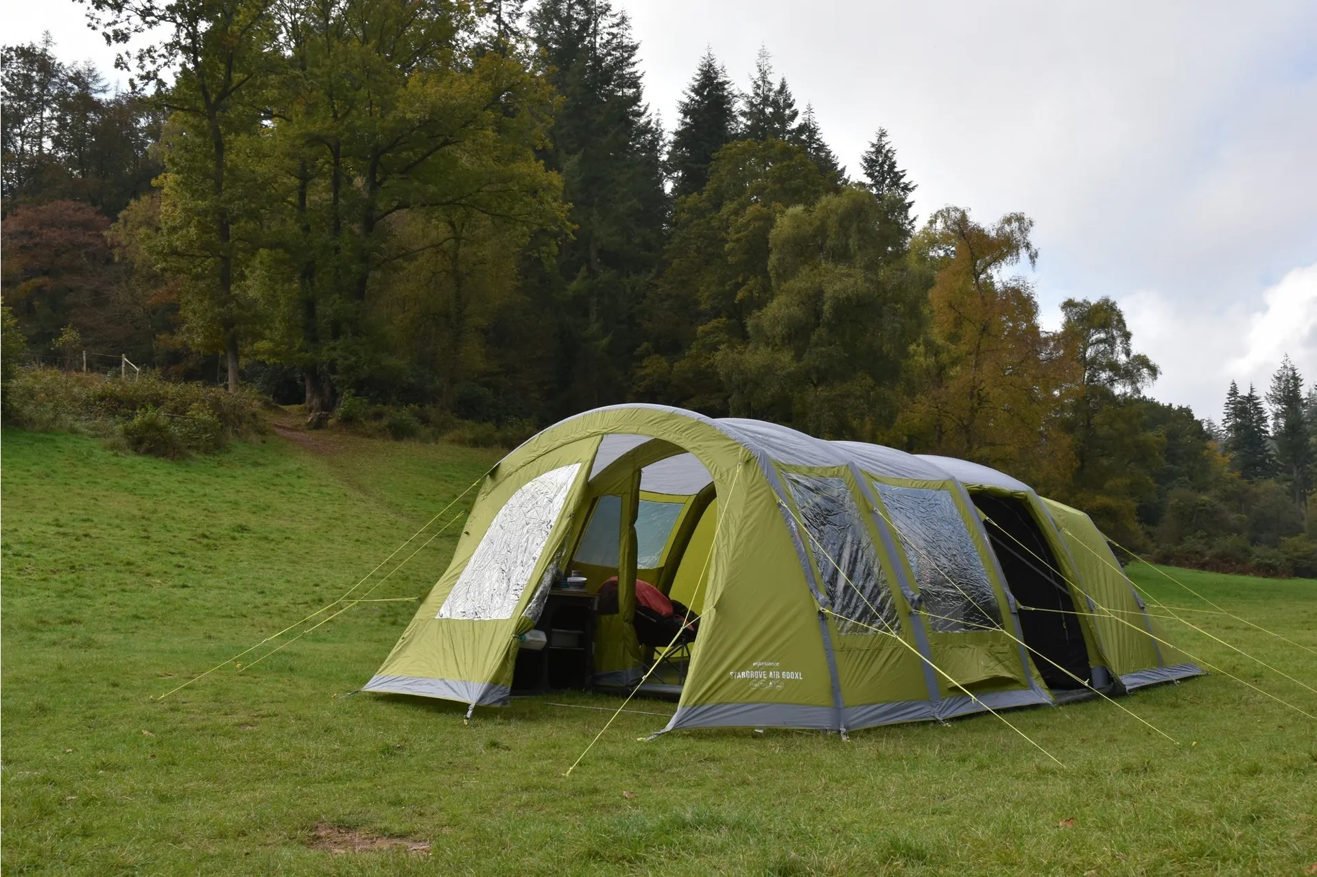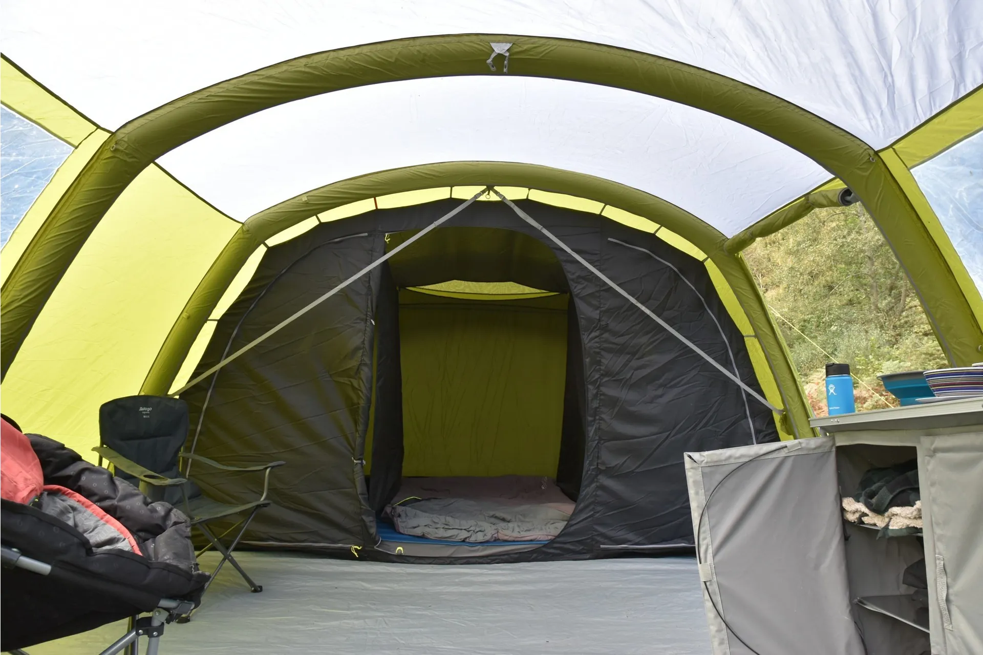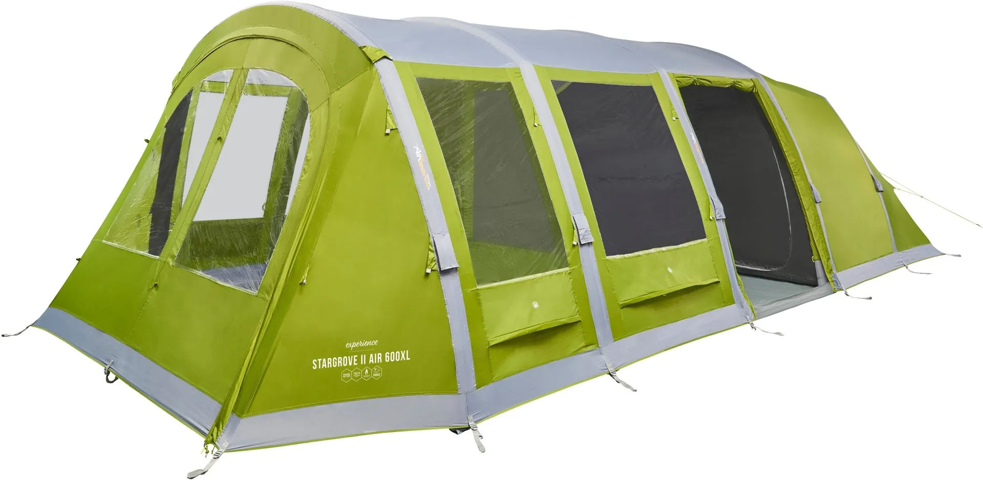 The Vango Stargrove II Air 600XL offers plenty of room for up to 6 people in its Nightfall bedrooms and features new diamond clear windows.