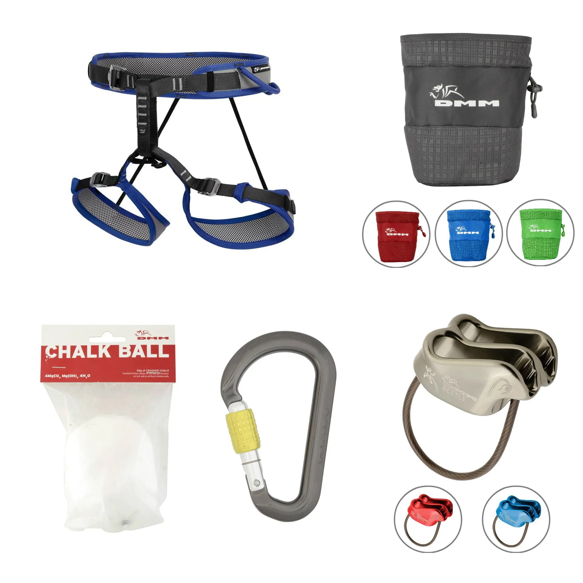 The DMM Viper harness package includes a Men's Viper harness, a DMM Mantis belay device, a Rhino HMS carabiner, a chalk bag and chalk ball, making it great value for new starters.