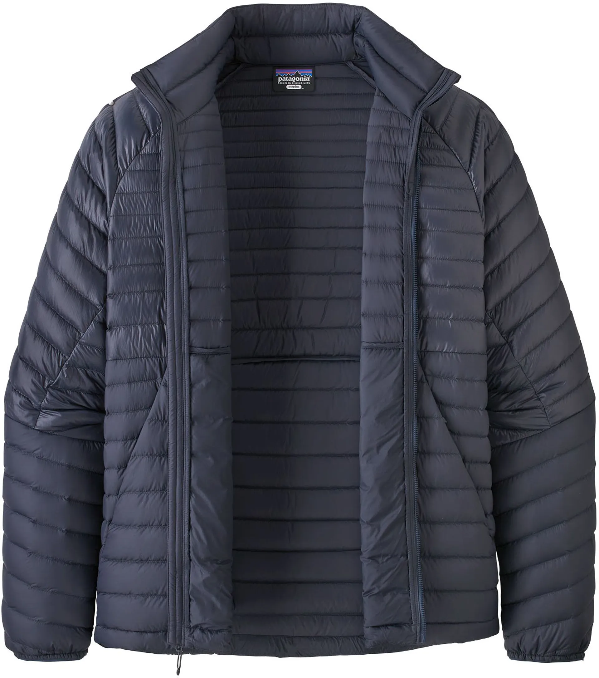 The Patagonia men's AlpLight Down Jacket uses NetPlus®, a 100% post-consumer recycled nylon fabric made from recycled fishing nets, to help reduce ocean plastic pollution.