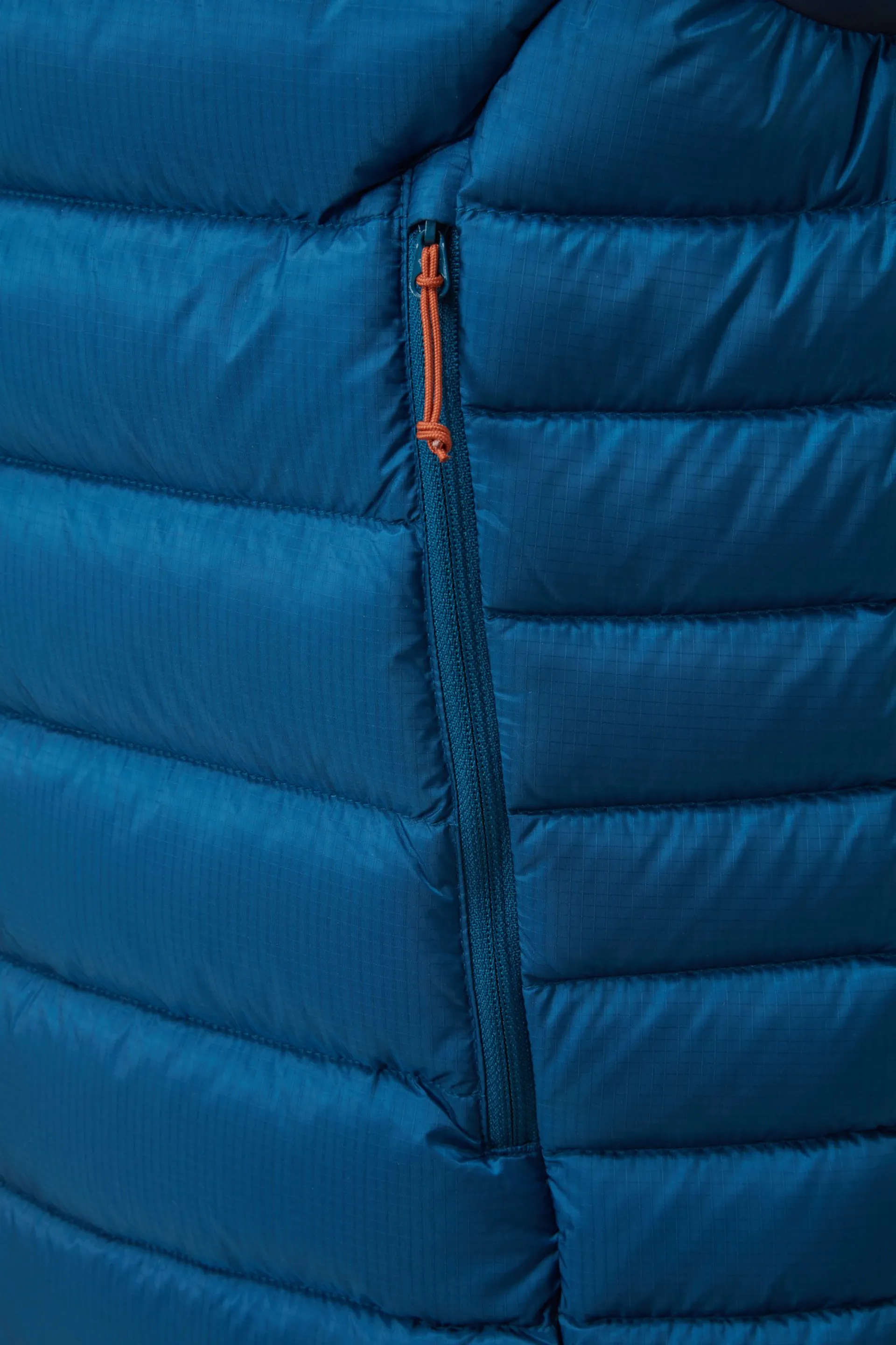 The zoned, midi and micro stitch-through baffle construction minimises the amount of outer fabric and stitching required during manufacturing, providing a significant weight saving. Inside these baffles is 800FP of Responsible Down Standard (R.D.S) Certified European Goose down that had a hydrophobic treatment applied at source during down processing. Fluorocarbon free, this down absorbs less water, dries faster and retains loft.