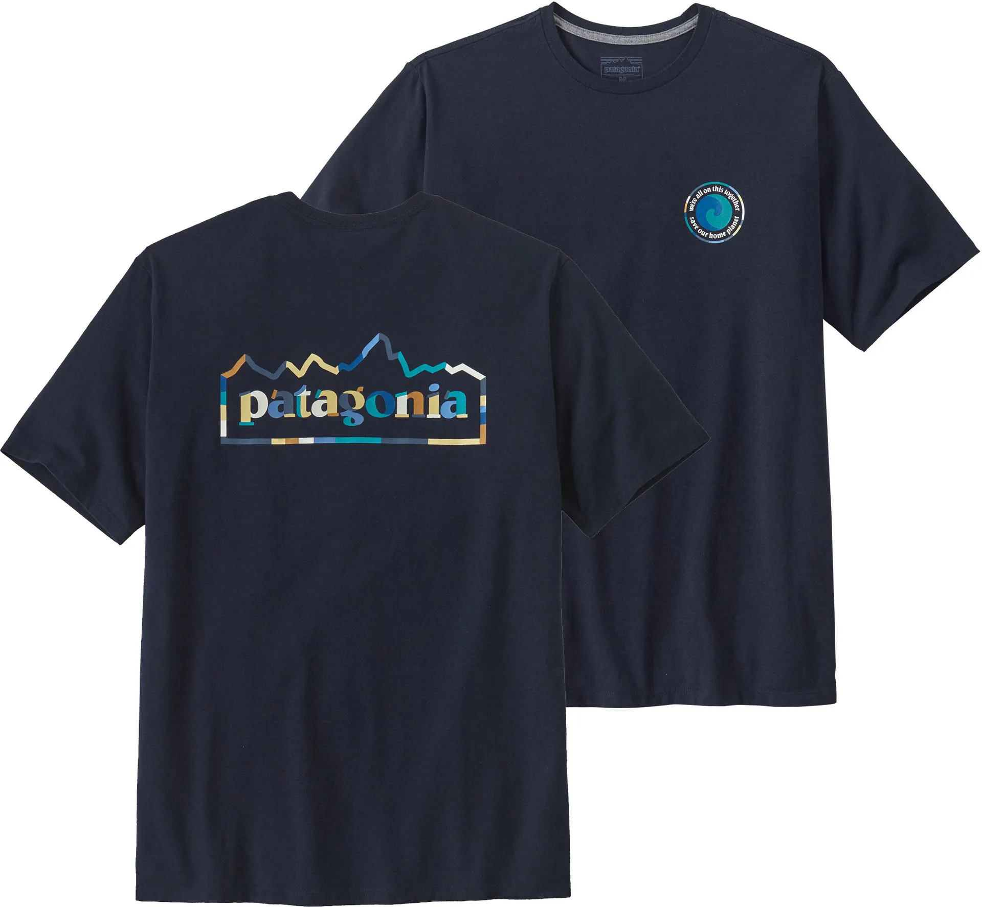 The artwork for the Unity Fitz styles has a stylized Earth and the message "we're all on this together," plus the gist of Patagonia's purpose statement "save our home planet."