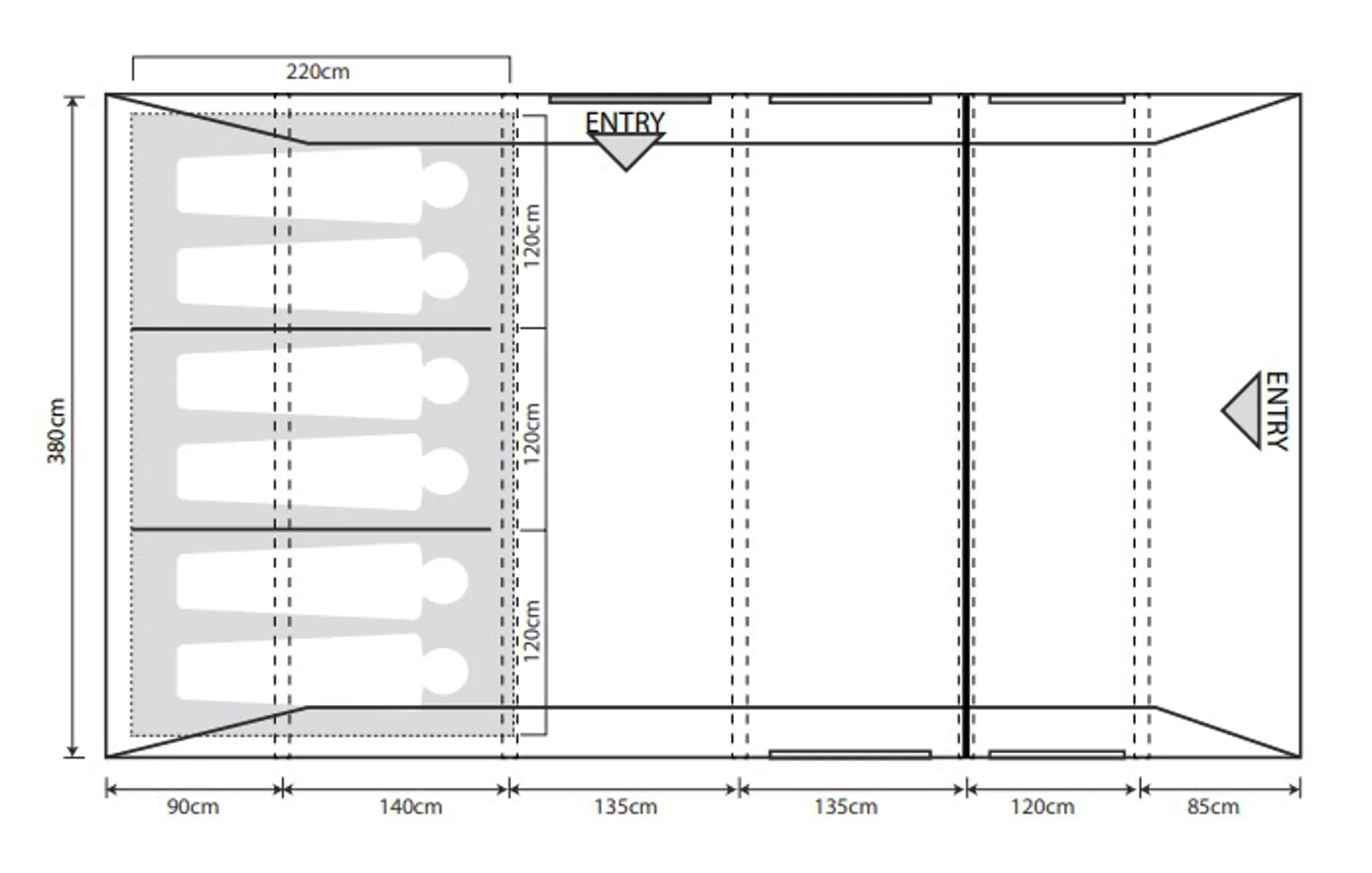ComfortThe bedroom features darkened roof panels and sides to reduce light penetration, and improve sleep quality. Two, toggled bedroom dividers between the varying bedrooms offer the option to create one large bedroom, a bedroom, and storage or three separate bedrooms. This inner tent allows 60-63cm of space per adult to comfortably settle down for a great night's sleep.