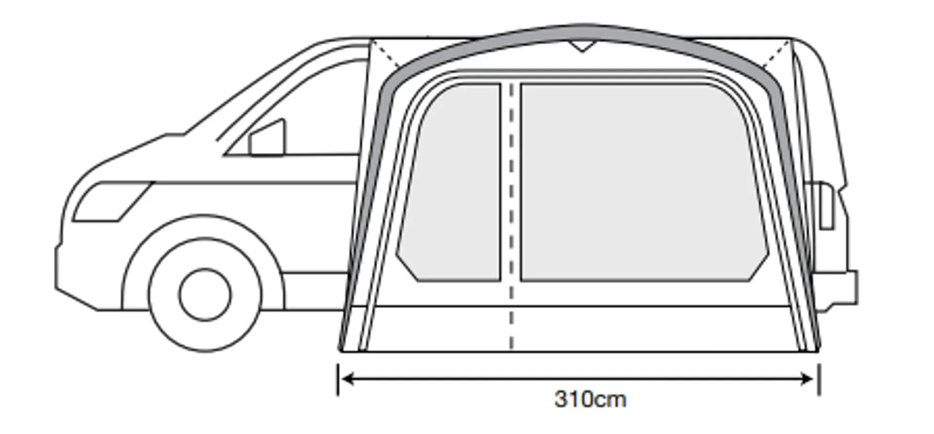 • Footprint of awning: 310 x 250cm (+100cm cowl depth)