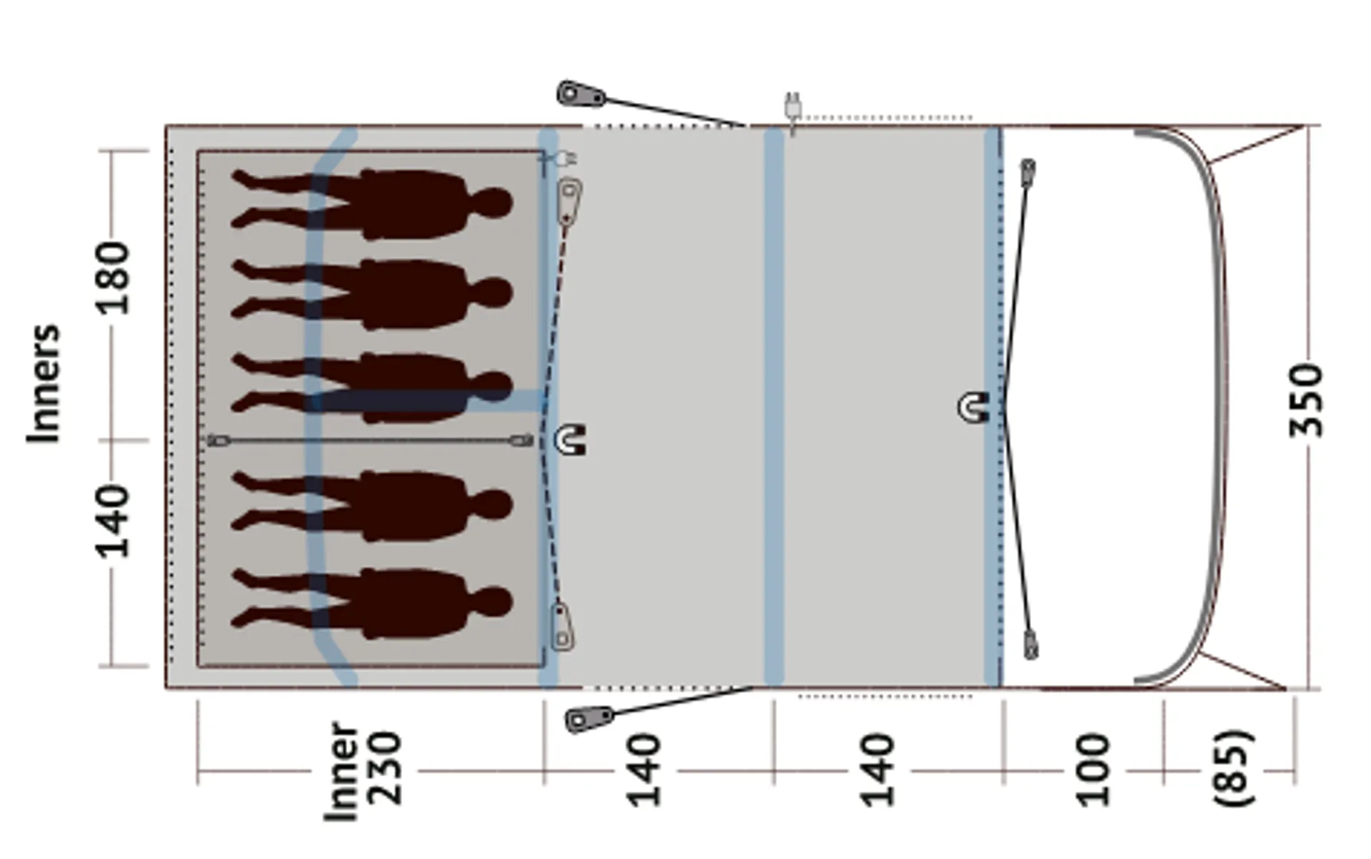 A zipped in bedroom divider can be rolled away to create one large bedroom and for flexible access and privacy, one half of the door can be rolled away to the side or both doors can be fully opened to the middle to create a open, spacious bedroom. Rather than the industry standard of 60cm width per person for sleeping compartments, Outwell Sleep Comfort allows 70-90cm for more freedom and suggest that 4 people can settle down comfortably for a great night's sleep.