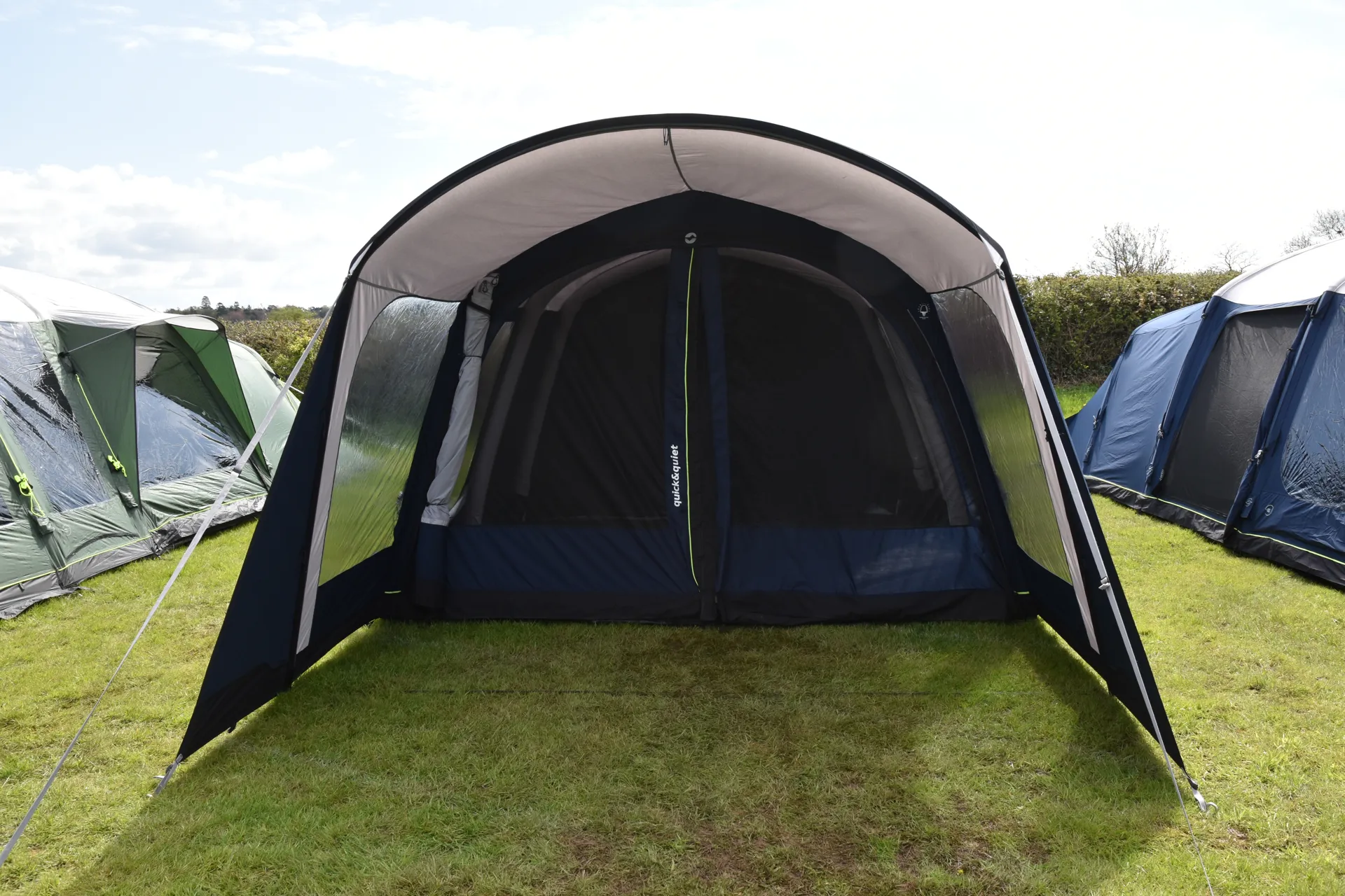 PrivacyA deep canopy over the front door, with toggle back sides, offers shelter from downpours, and two side doors provide quick access into the main living area. Two, large tinted windows offers unrestricted views - even when sat down, and zip up curtains on the inside of the tent offer full flexibility of choice between total privacy, letting in some daylight or enjoying the views.