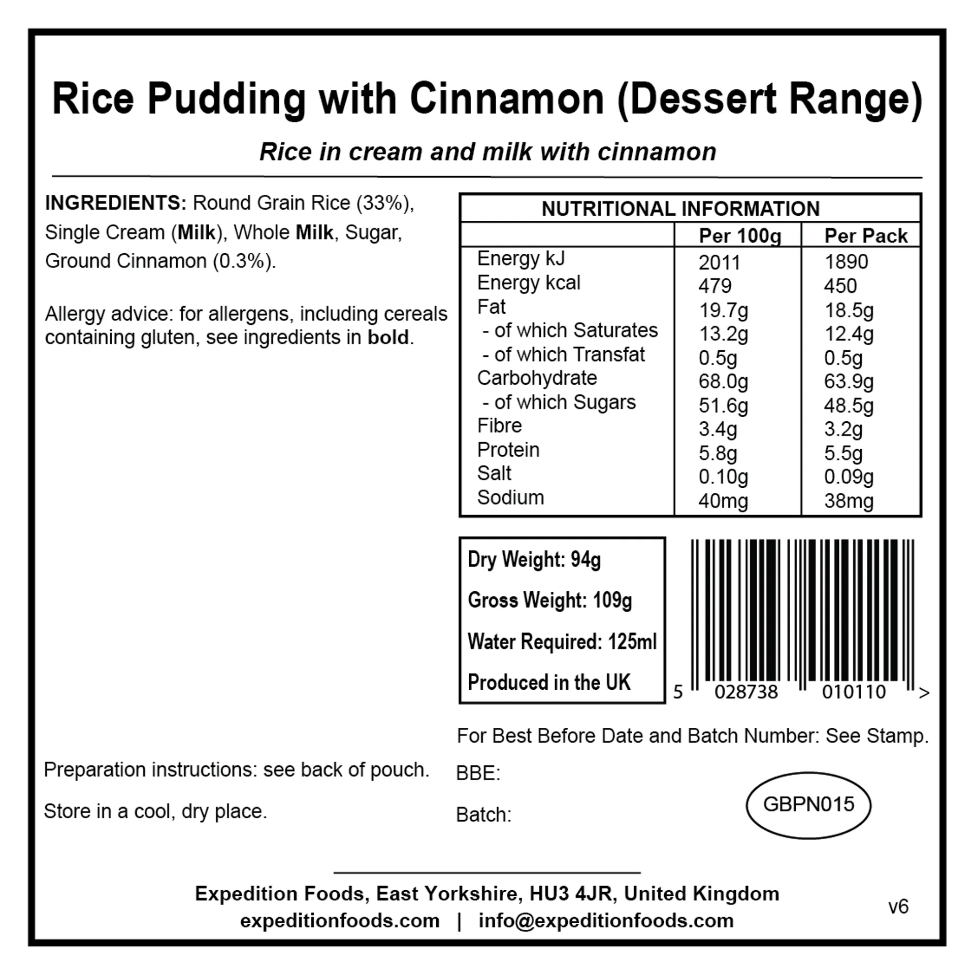 Expedition Foods Rice Pudding with Cinnamon - Dessert Range