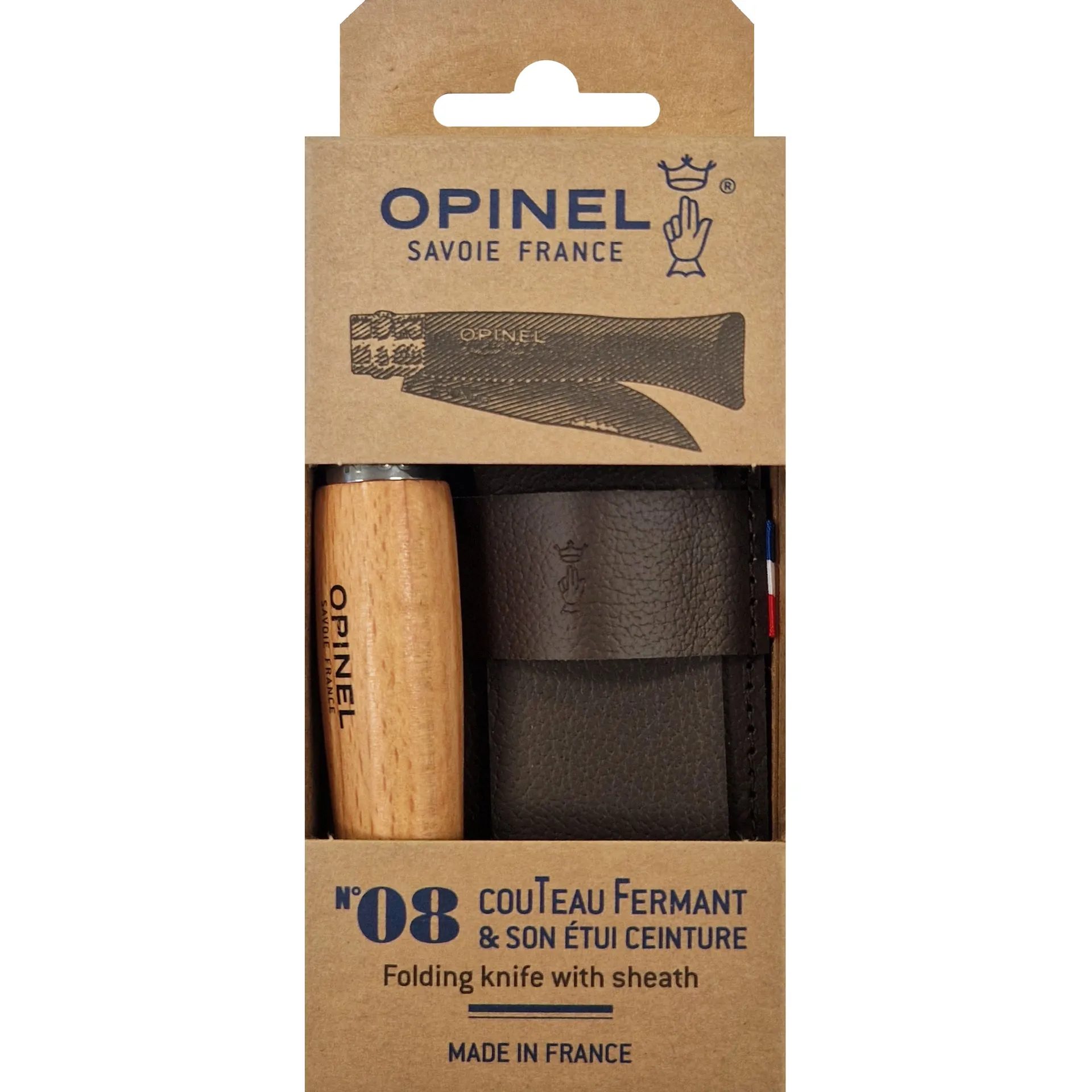 The Opinel N°08 is THE versatile knife: essential during sports, bivouacs, it also is very appreciated for fishing and hunting. With its alpine sheath that has a passing and a leather lace, it will follow you everywhere.