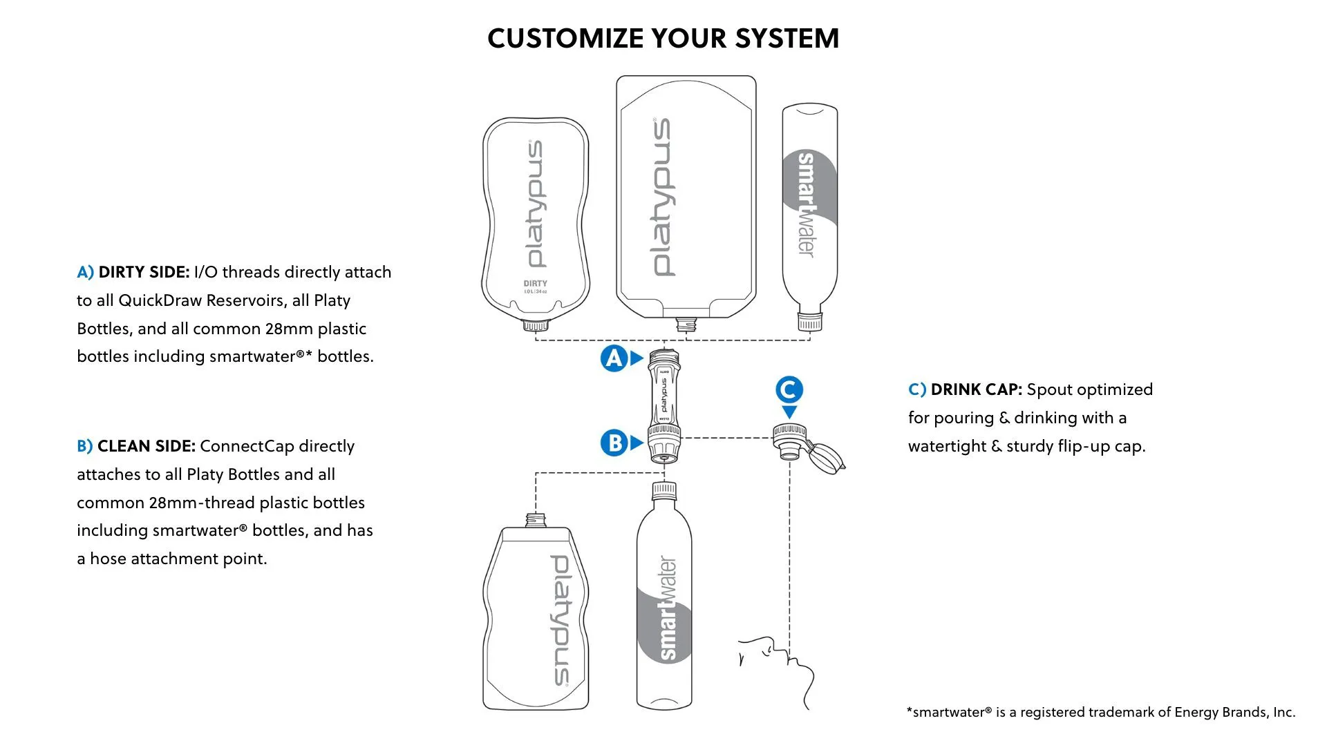 • Compatible Vessels: QuickDraw reservoirs, smartwater bottles and other narrow-mouth 28mm bottles, Platy 2.0L, Platy SoftBottle™, Platy Water Tank.